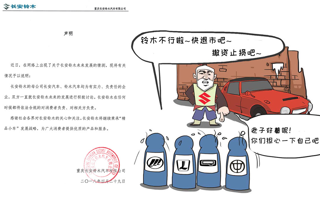不过随后没两天,铃木就瞬速出来辟谣,官网发表声明,表示将对消费者负责,继续为消费者提供产品和服务。
