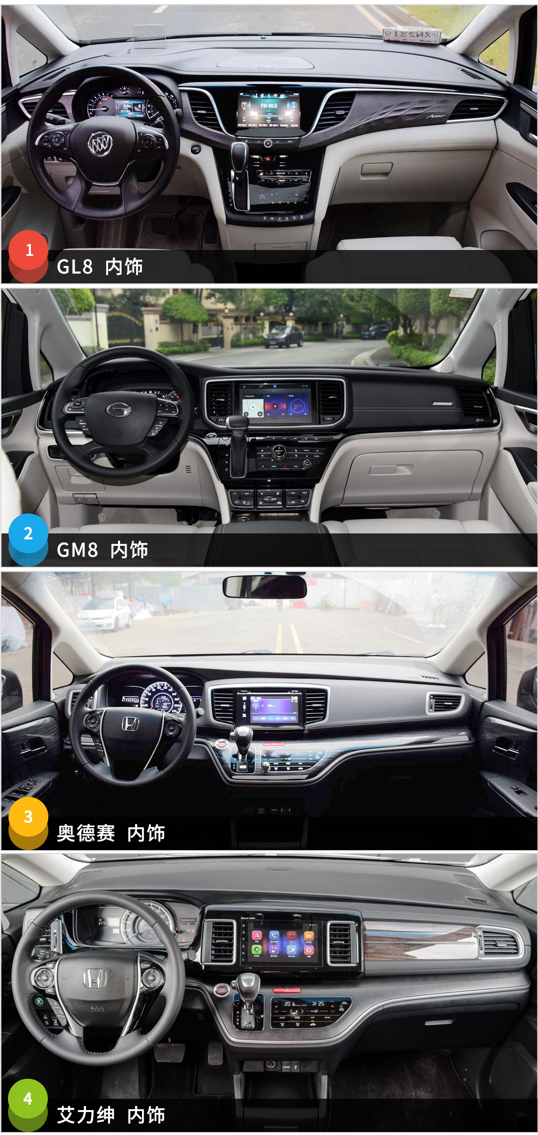 内饰方面GL8的采用了别克的家族样式,用料考究,做工也颇为精致,挺符合GL8定位的商务气质;GM8的内饰跟它的外形一样,也是有着浓浓的商务气息,中央多媒体的10.1英寸显示屏非常显眼,而作为20多万级别的中国品牌,用料基本不用再担心,整体表现足够厚道,各个配件之间做得也非常细致;如果蒙着眼进入奥德赛和艾力绅车内,恐怕睁眼的瞬间还真说不清是哪台是哪台。内饰的差别不是特别明显,去除细节上的调整基本都是一个模子出来的,不过艾力绅的装饰板采用抛光木纹材质,使得加重车内的严肃感。