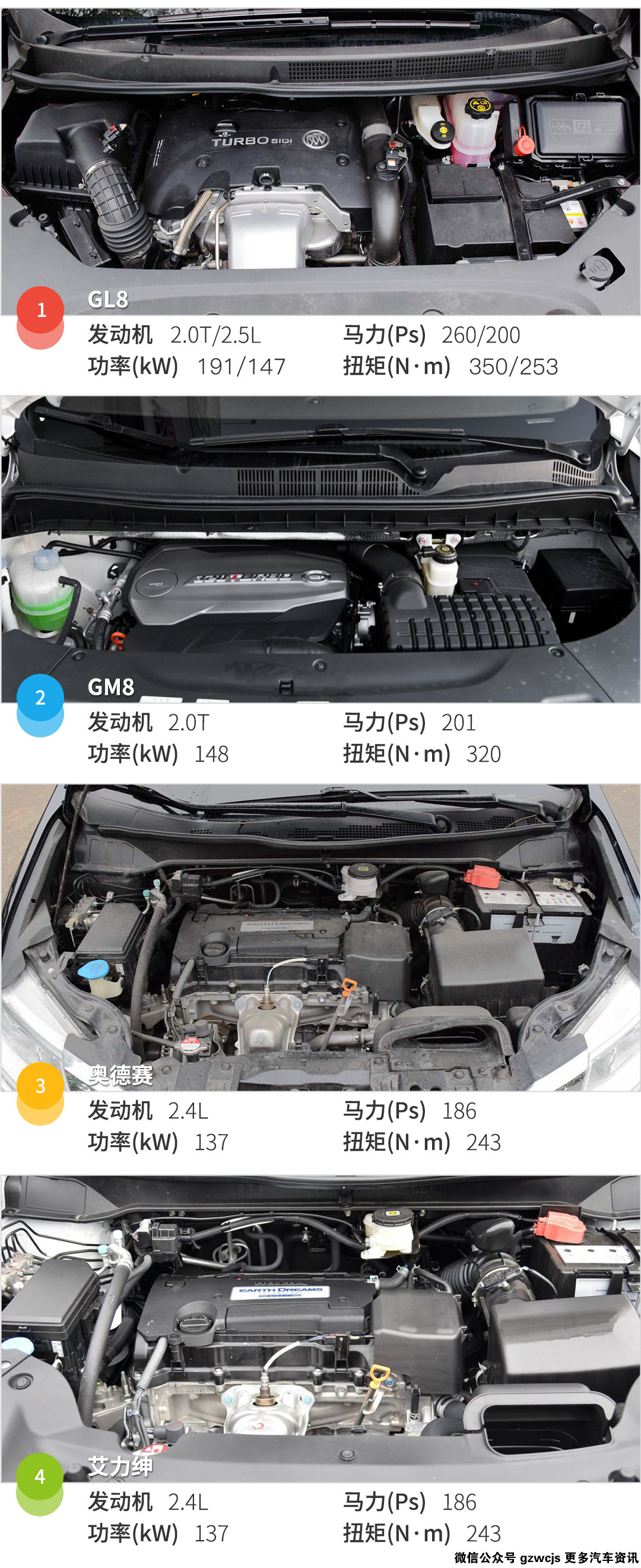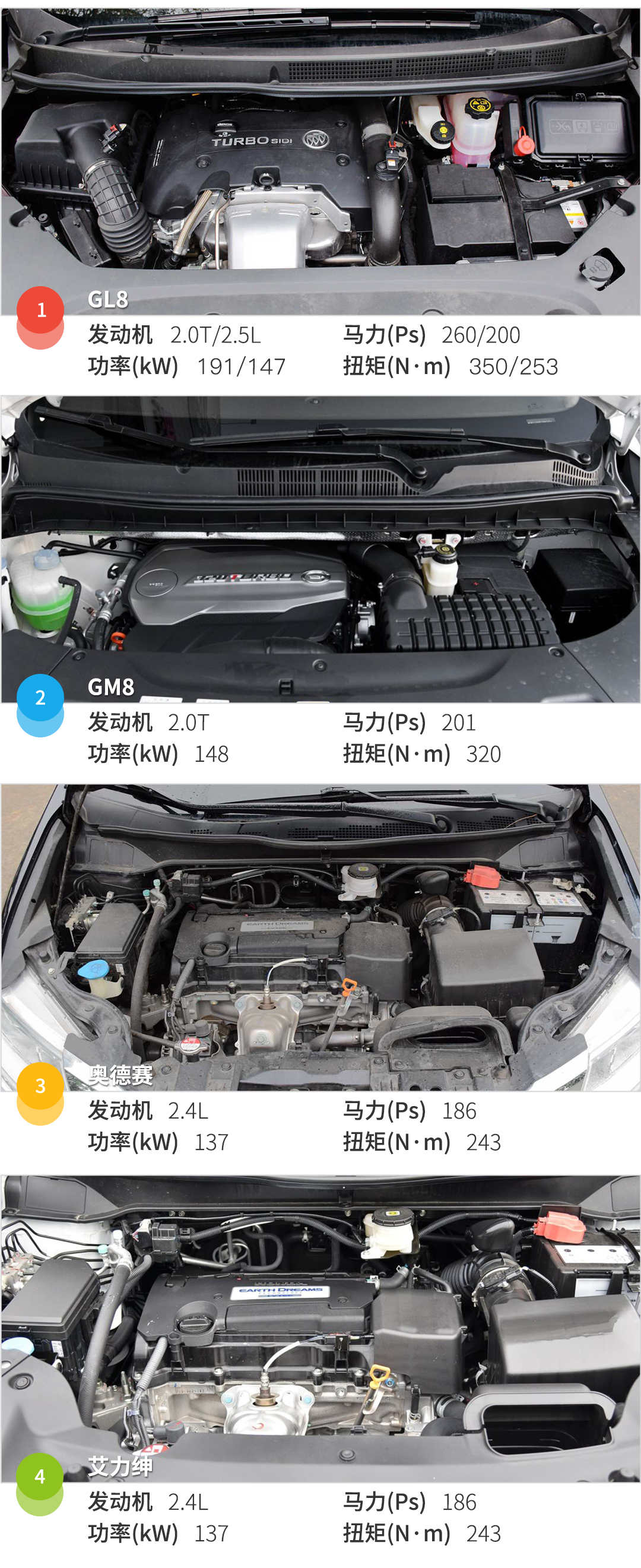 目前在售的GL8采用2.0T和2.5L的发动机,其中2.0T发动机曾荣获“沃德十佳发动机”,变速箱部分采用带启停功能的6速手自一体变速箱。第一次开上2.0T的GL8时,着实被其提升后的动力所小小惊艳了一番,即使GL8的“体重”接近2吨,在这台发动机的拖动下,都不会给人以动力不足的感觉;GM8全系清一色采用2.0T发动机,不过账面数据上不够GL8的2.0T抢眼。整体平顺性感觉很不错,动力响应也可以,就是开久之后会感觉很“沉闷”,当然,别忘了MPV要的就是平稳;奥德思跟艾力绅这两兄弟配的都是同一款发动机,就连变速箱也一样。在动力上2.4L的爆发力比GL8的2.0T还是差了点,但是得益于CVT变速箱的特性,这两部车的平顺程度是这次对比里最出色的。动力表现上艾力绅的油门响应比奥德赛沉稳很多,实际乘坐感受上艾力绅更加柔软稳健,对弹跳的抑制能力也要强于奥德赛,而奥德赛则显得十分轻盈。