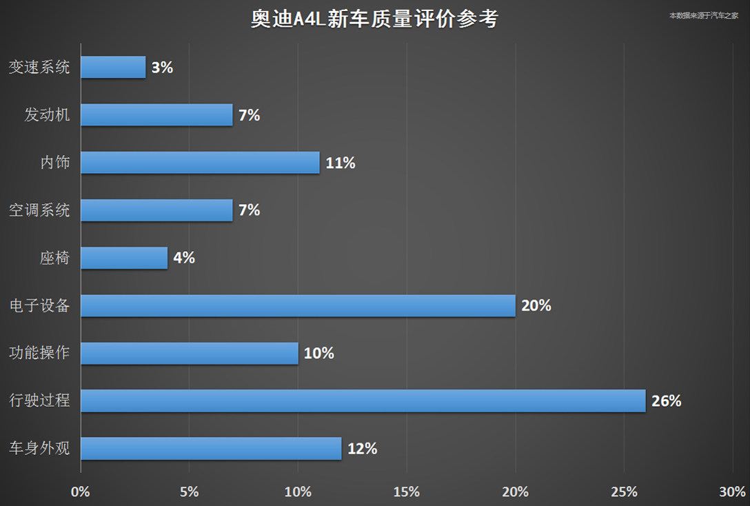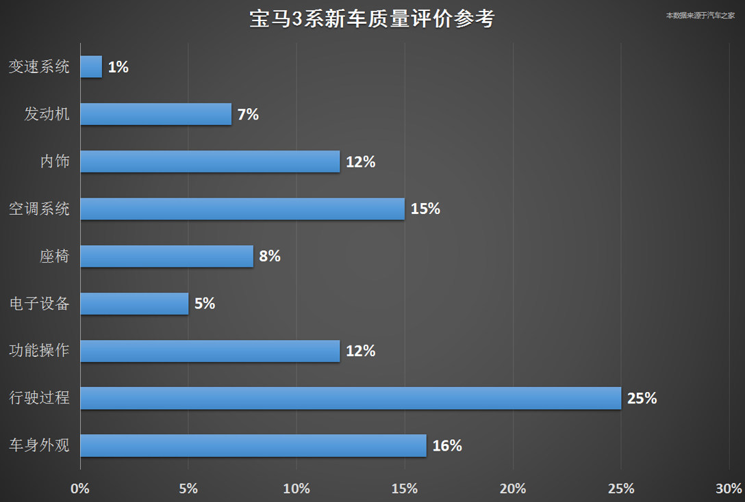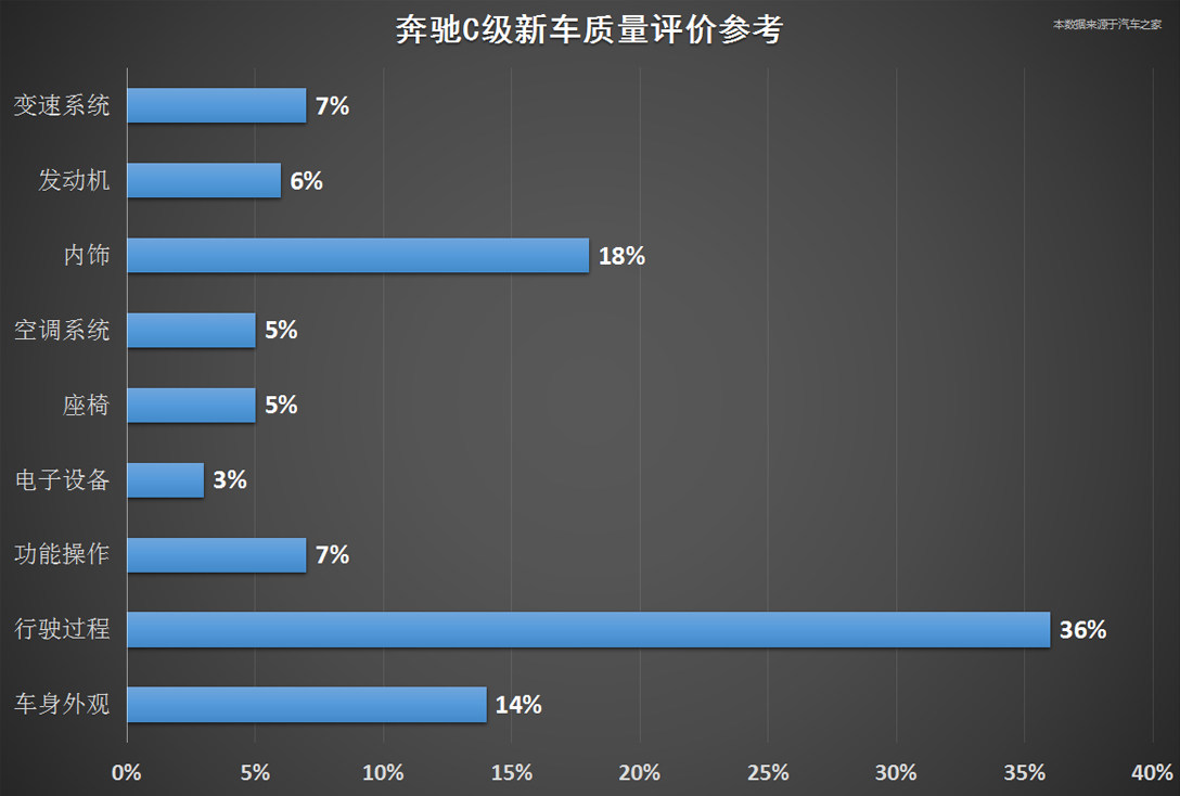我们通过百位新车车主的质量反馈数据可以看出,C级在行驶过程和内饰问题的比例分别位列一、二位置,其中刹车过程有杂音和由于内饰装配工艺问题产生的异响反馈最多;3系普遍反应轮圈刹车粉尘过多和刹车时会有摩擦杂音;而A4L在电子设备问题上音响的不正常抖动和共鸣声反馈最多,还有就是在行驶过程方面,反馈最多的是怠速时车身会有明显的抖动。