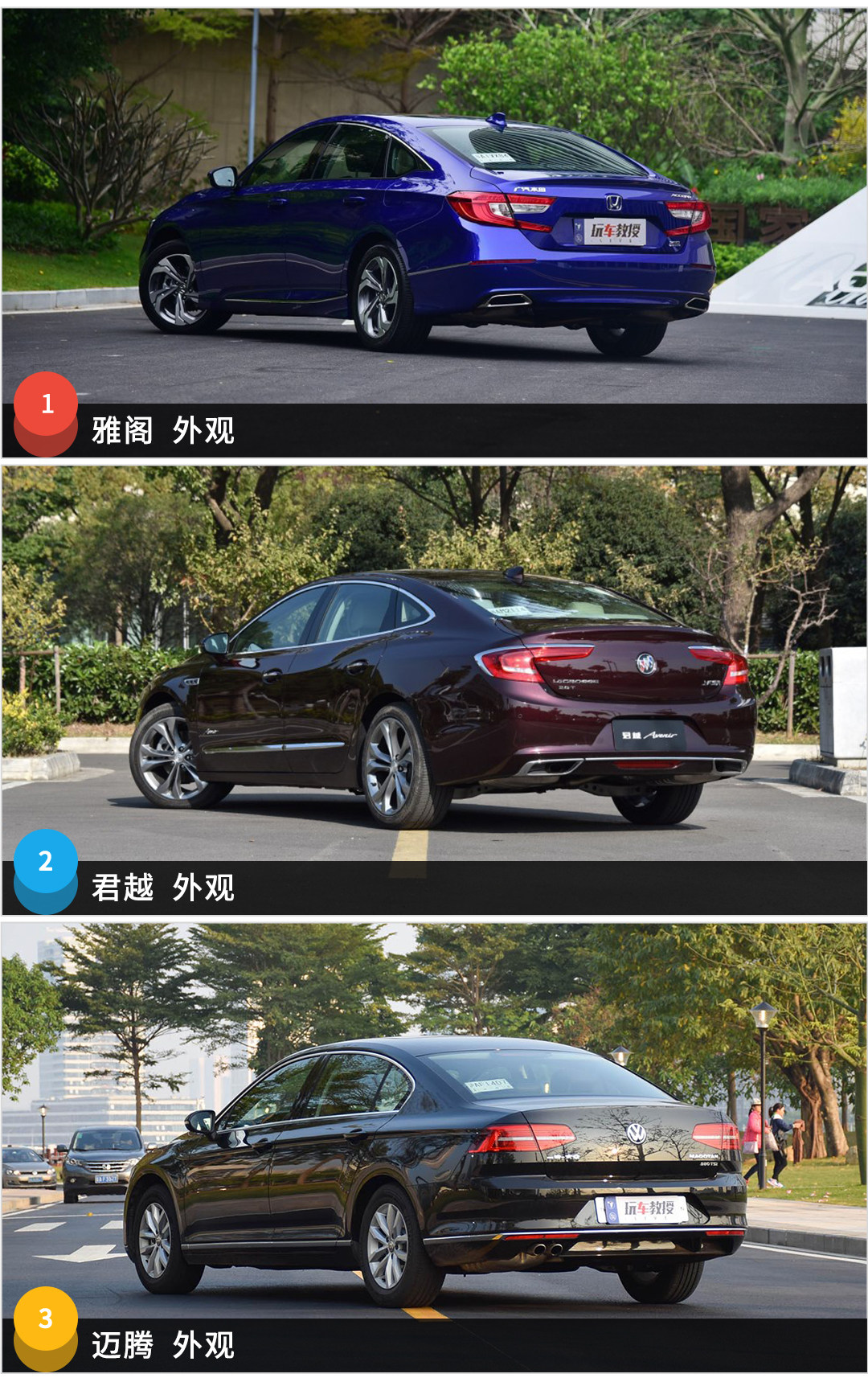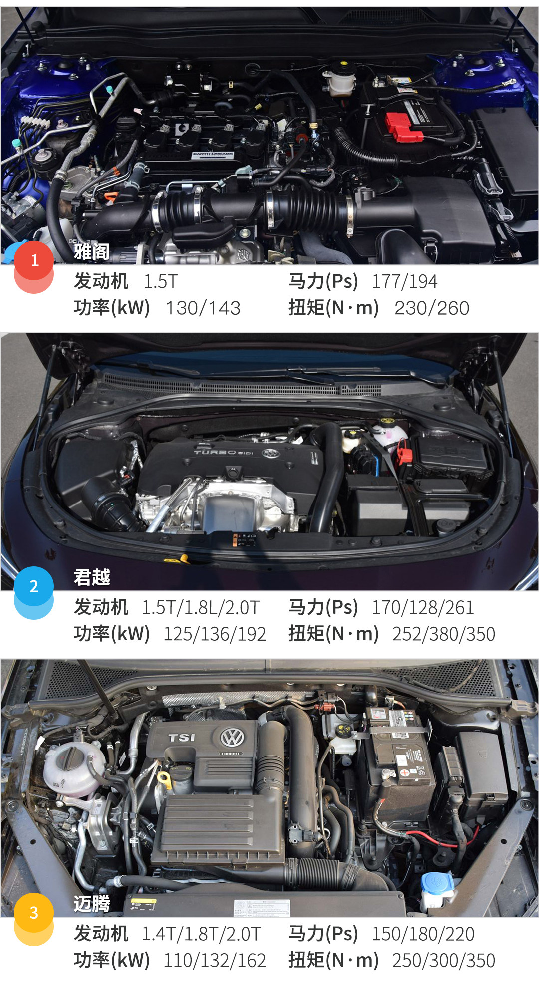 国产雅阁目前全系配备1.5T发动机,2.0T车型暂不引入。发动机分为高低功率两个版本。除了1.5T车型外,未来还将有混动车型推出,搭配CVT变速箱,和海外版相同。驾驶感受上新雅阁的转向令人留下深刻印象,可惜CVT变速箱没有想象中那么运动,只能说很适宜城市道路行驶。迈腾的动力系统表现相当得优秀,与雅阁和凯美瑞不同。不会太柔,也不会过于激进,第三代EA888与DQ380的配合非常默契,升降档的速度都很快,就是在低速拥堵下偶尔还是会出现明显的顿挫。君越堪比中大型车的NVH表现着实令人感到惊艳,动力表现也相当出色,变速箱的动力衔接也更平顺,没有雅阁那种“无聊”的提速感觉,也没有迈腾低速下的顿挫。