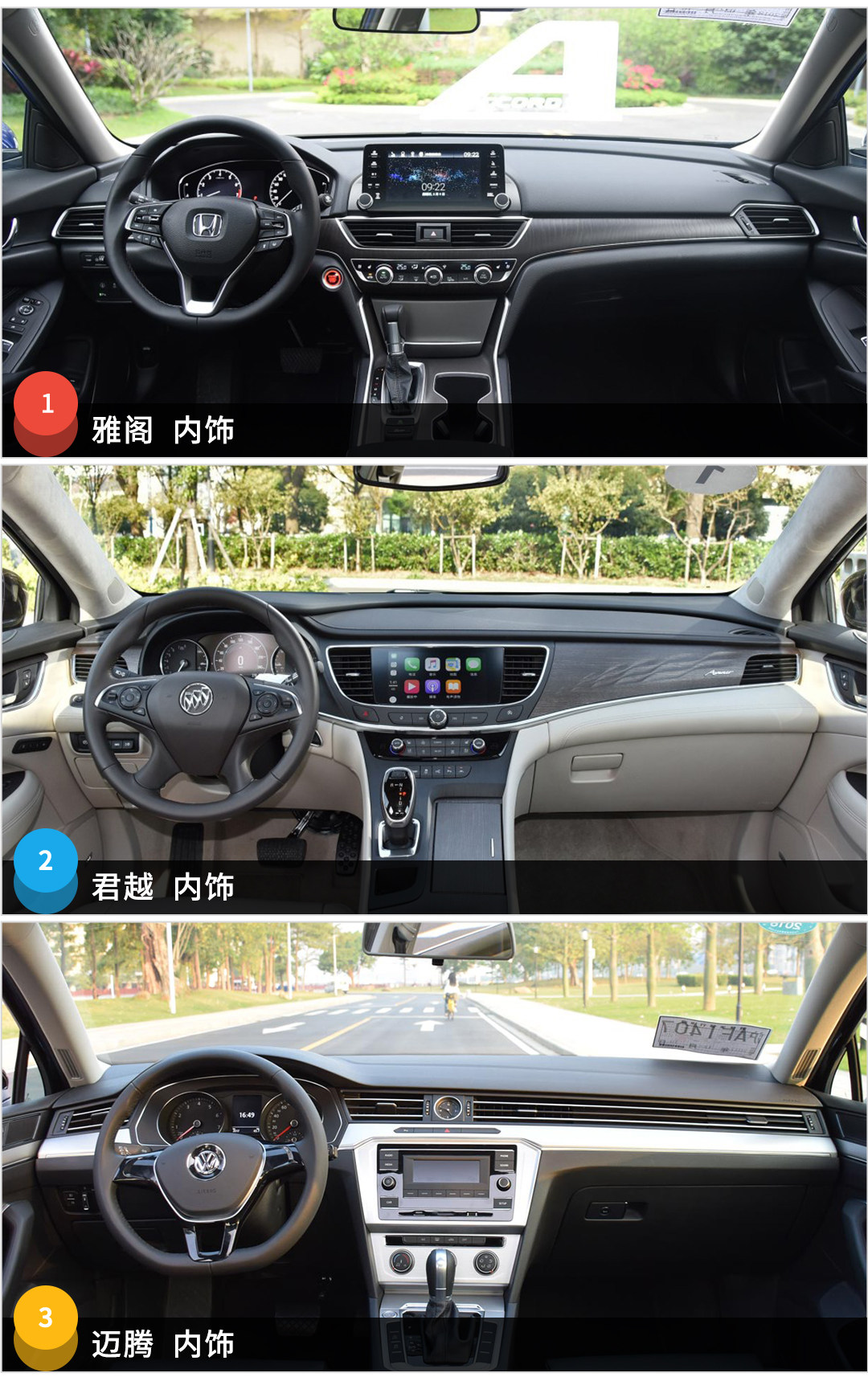 第十代雅阁内饰依然依旧熟悉的本田风格,黑色搭深色木纹的风格简单明了,另外这次雅阁还推出了红色内饰,看起来更加突出运动感。相比起雅阁的运动,君越则显得豪华许多,手碰到的基本都是软性材质,向中控台下层这样腿会磕碰到的位置,还贴心的加入了皮革。迈腾的内饰整体的豪华感也很强,做进去的氛围很有质感,车内的木纹装饰用的面积不大,但却很好地提升了车内整体氛围,再加上内饰氛围灯做得相当的棒,柔和不刺眼。