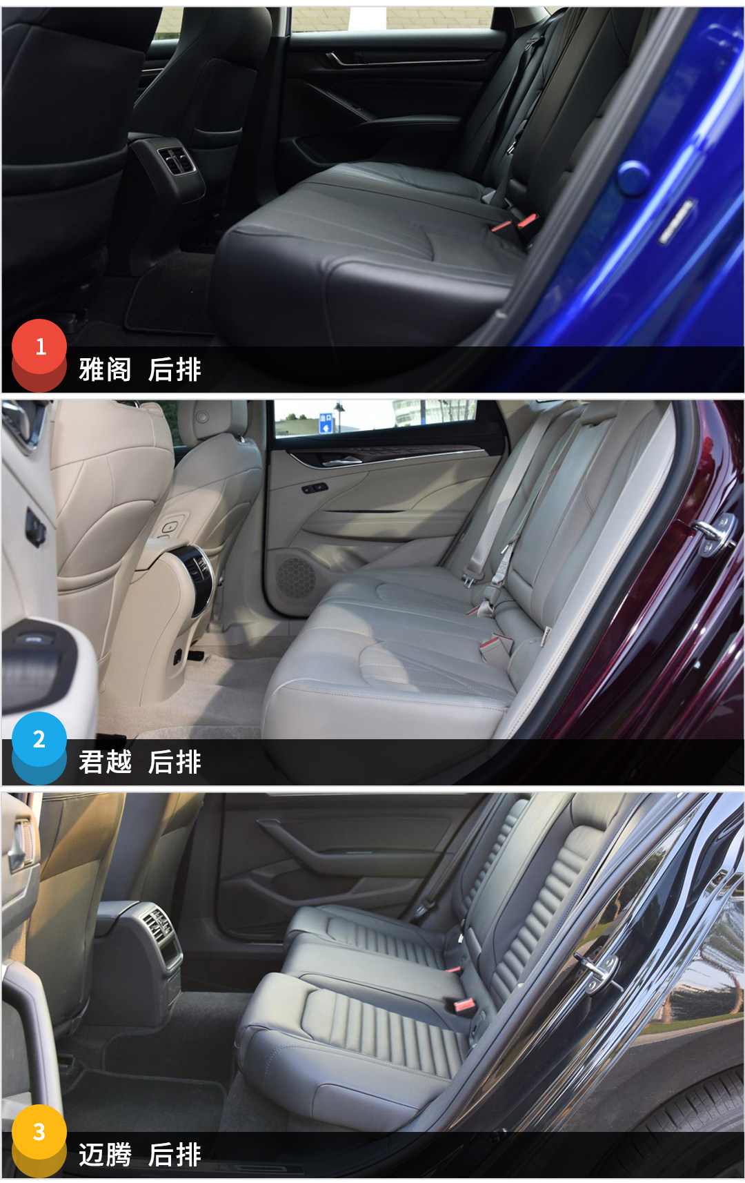 去到后排来看,雅阁的后排这一次确实够惊艳,每一个人都对它的乘坐空间表示赞叹,前排调到合适的空间,后排还有很大的余量,轴距长带来了实打实的效果,座椅的柔软度也备受好评。君越长度跟轴距是三台车里面最长的,但是表现则是三台里居中的,后排空间表现一般,但优点是后排中间乘客的舒适性还可以。最后的是“一哥”迈腾,真的不愧是“一哥”,后排空间相当得优秀,翘个二郎腿毫无压力,翘完前面还有很多松动的空间。