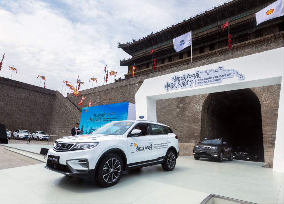 发车仪式后,吉利汽车销售公司副总经理陈洪生,与壳牌(中国)OEM业务市场总监刘莉共同敲响鼓声,为“挑战100度”中欧品质行博越车队壮行,4辆2018款博越组成的车队从西安出发,一场为期两个月的“挑战100度”中欧品质行正式开启。