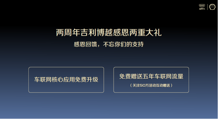 为感恩每一位用户的信赖和认可,吉利汽车在活动现场发布了针对2016款博越的“老车主车机升级政策”,通过新政策的落地,2016款博越能实现核心应用的免费升级,包括:界面升级、导航升级、音乐升级,并且与2018款博越一样享受免费的5年车联网流量(购车之日起计算)。2016款吉利博越全面升级车联网系统不仅让每一个博越用户都能感受智能互联SUV的新价值、新体验,更重要的是这种做法开创汽车行业用车后市场老用户回馈新服务,树立了行业以用户为中心服务理念的新标杆。