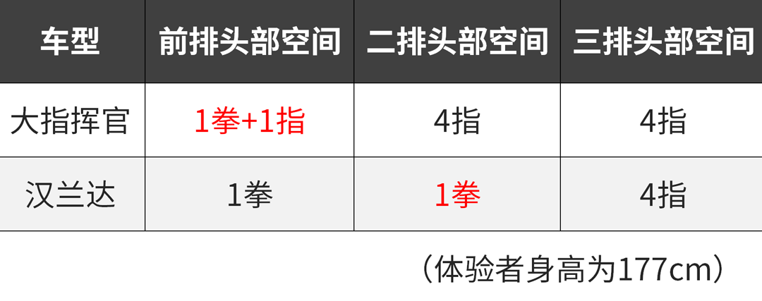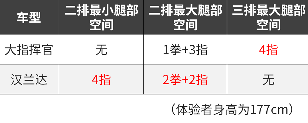 虽然大指挥官的二排在最小和最大腿部空间上都不如汉兰达,但是第三排在最好的情况下能调出四指的腿部空间。不过这还是有点鸡肋,满载时,不仅三排的人会坐得比较局促,连二排乘客也会随之遭殃。