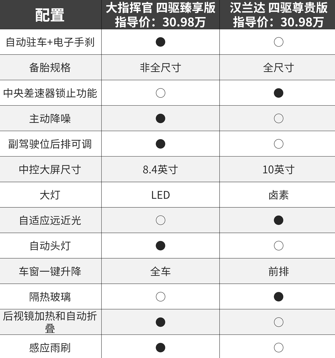 从上面的配置对比来看,在相同指导价下,大指挥官的配置表现是要略微好于汉兰达。尽管这款汉兰达的售价高达30多万,但依旧采用的是卤素大灯,车窗一键升降也仅装备于前排,这些都是不应该的。