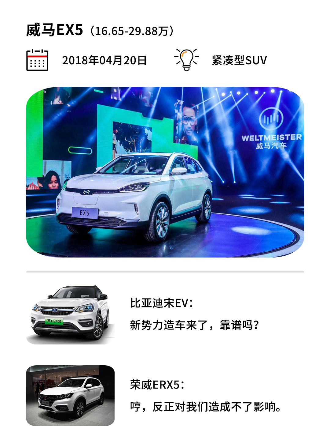 威马EX5是一款非常具有市场潜力的电动SUV,虽然是新品牌下的新车型,但是威马公司背后的技术背书和他们自建工厂的生产方式让他们的品牌形象显得十分靠谱。而威马EX5的实车已经正式上市,在2018年下半年就可以正式交付,EX5的设计非常符合大众审美,属于十分耐看的一款车型,而且续航里程可以达到400多公里的动力特性,也让它十分有成为一二线限行城市的热销车型的潜力。