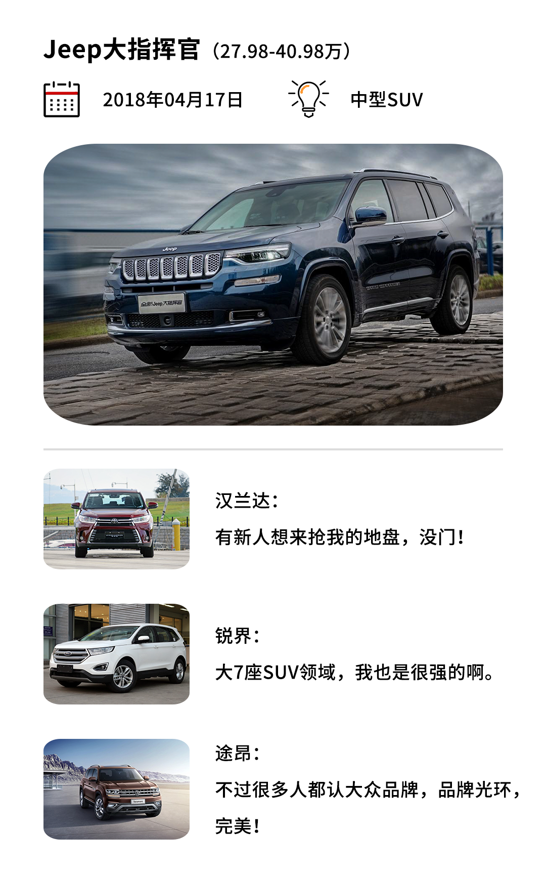 Jeep在中国市场上的发力趋势愈发明显,相继自由光,指南者这类车型在国内市场获得一定成功以后,现如今又推出了一款中国特供的中型SUV,大指挥官。虽然这款车型是一款低于大切诺基的中型SUV,但是它的外观与内饰设计,配置供给与装配工艺等等方面都基本上称得上是现如今合资国产的Jeep车型中的旗舰。售价区间与汉兰达,锐界等车型有着高度重合,未来中型7座SUV中的强有力竞争者势必将会多出大指挥官的身影。