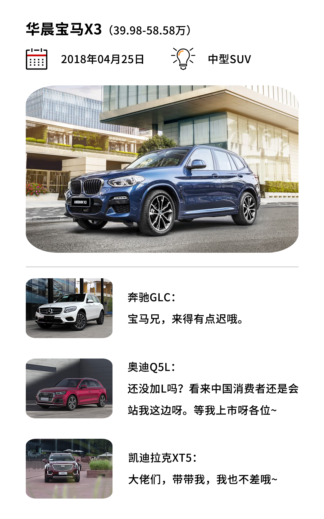 GLC和Q5在BBA的豪华中型SUV市场称雄已久,操控大师宝马也就看不过眼了,华晨宝马X3正式在中国上市,都说它没有加长会影响车内空间,但其实这款车型换代后本就有了一定车身尺寸上的增加,所以空间并不是什么硬伤,相反,更原汁原味的引入国产化后的Q3势必会成为BBA中型SUV中最具运动基因的一款车型,而广大宝马迷们在X3上市以后也必定有了更为接地气和更实惠的车型备选方案。