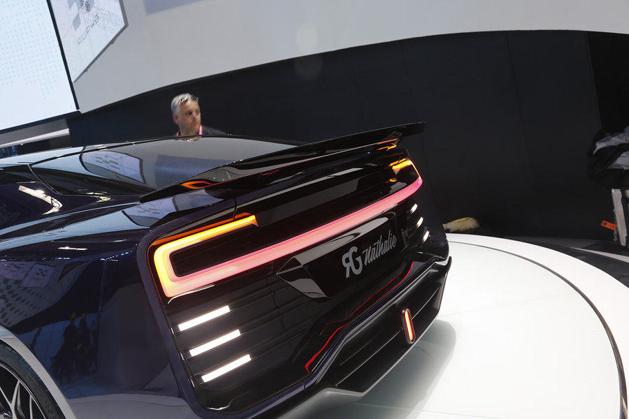 车尾的视觉冲击力相比车头来的更为猛烈,横向多层次的大尺寸黑色饰板(有三条横向的矩形灯带)与贯穿式尾灯相辅相成,使得整个车尾层次感十足,而上下配备的后扰流板与扩散器也让这辆电动跑车难掩速度与激情。