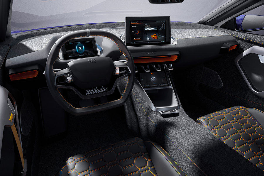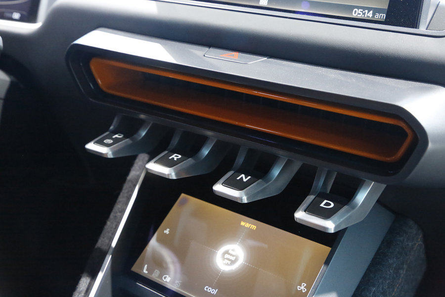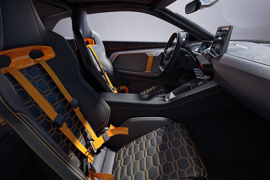 不过即便是辆驾驶机器的模样,它在舒适性和设计感方面并没有偷懒,平底方向盘由真皮包裹并伴有橘黄色缝线点缀,中控台不多的物理按键使用了类似飞机驾驶舱的设计,左中右三处空调出风口亮丽的橘黄色与整个驾驶室的灰色氛围形成冲击,再加上触手可及的Alcantara翻毛皮材质,整个车内很好地兼顾了运动感与舒适感。