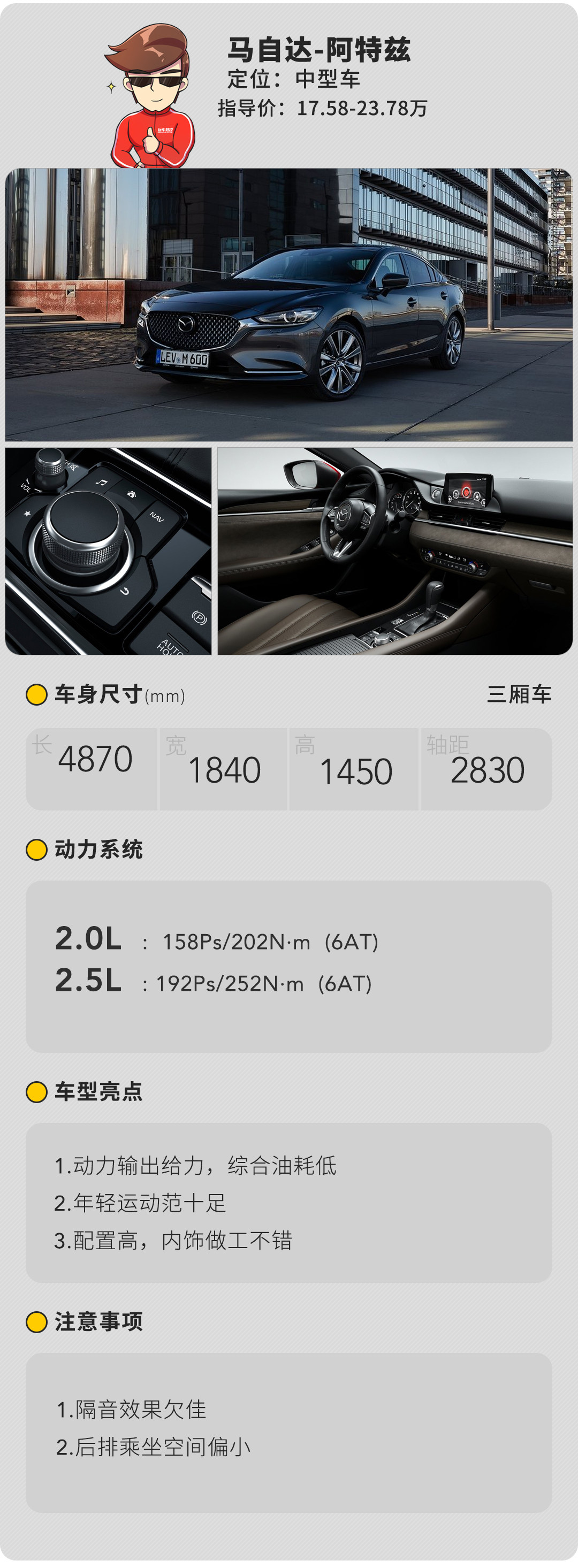 教授点评:说运动车必然少不了阿特兹,毕竟其运动属性可是深入人心,魂动理念下的高颜值我们在这就不赘述了,来说说最新款阿特兹的配置,18款的阿特兹在配置上可谓是诚意满满,无论是主动配置还是操控配置那都是异常的丰富。值得一提的是,新款的阿特兹新加入了一套GVC加速度矢量控制系统,可进一步全面的提升其运动操控感,驾驶体验会更有趣味性。另外,阿特兹看起来是有点不温不火,但是从其销量和定位上来看,八九不离十都是在闷声发大财。