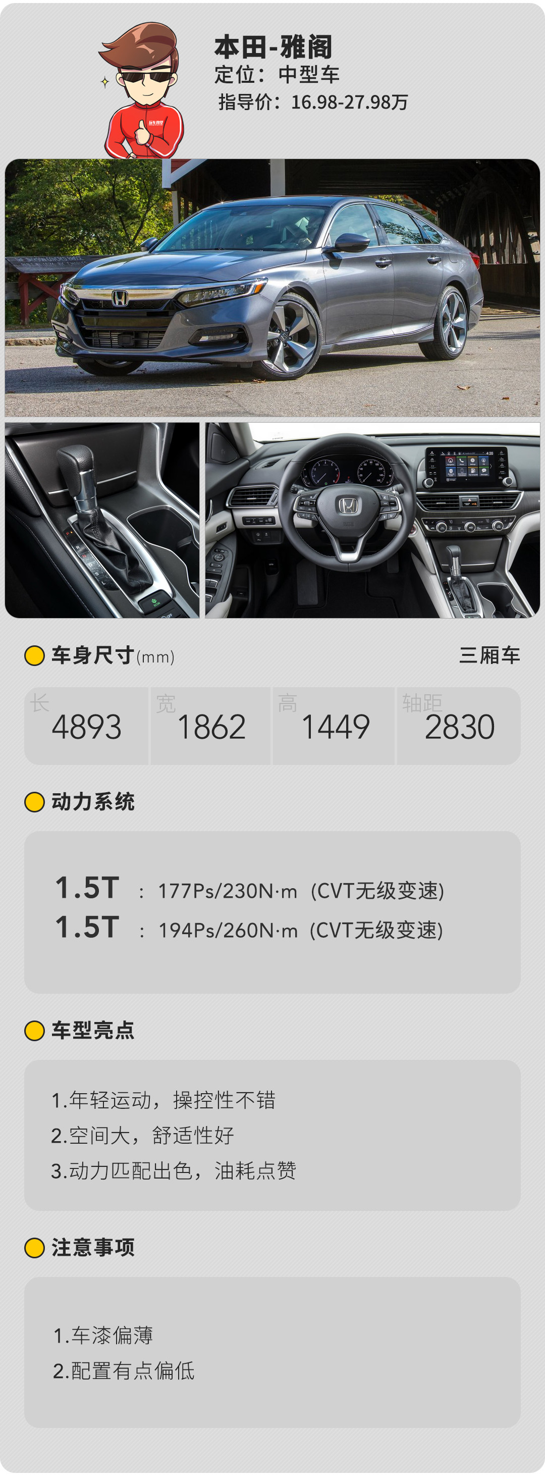 教授点评:十代雅阁颠覆了其在人们心中的传统形象,激进的运动气质,轿跑似的身姿以及加长的车身更显年轻活力和视觉冲击力,可是一直令人期待的2.0T+10AT却并未搭载在新一代雅阁之上,不免令人感到些许失落,但1.5T+CVT无级变速器的动力总成所带来的7.6秒加速成绩以及超强的乘坐舒适感,还是令人很惊艳。而依靠惊为天人的颜值和全面提升的实力,面对更为年轻化的90后市场新生代雅阁也是竞争力十足,至于在售价方面也是十分给力。