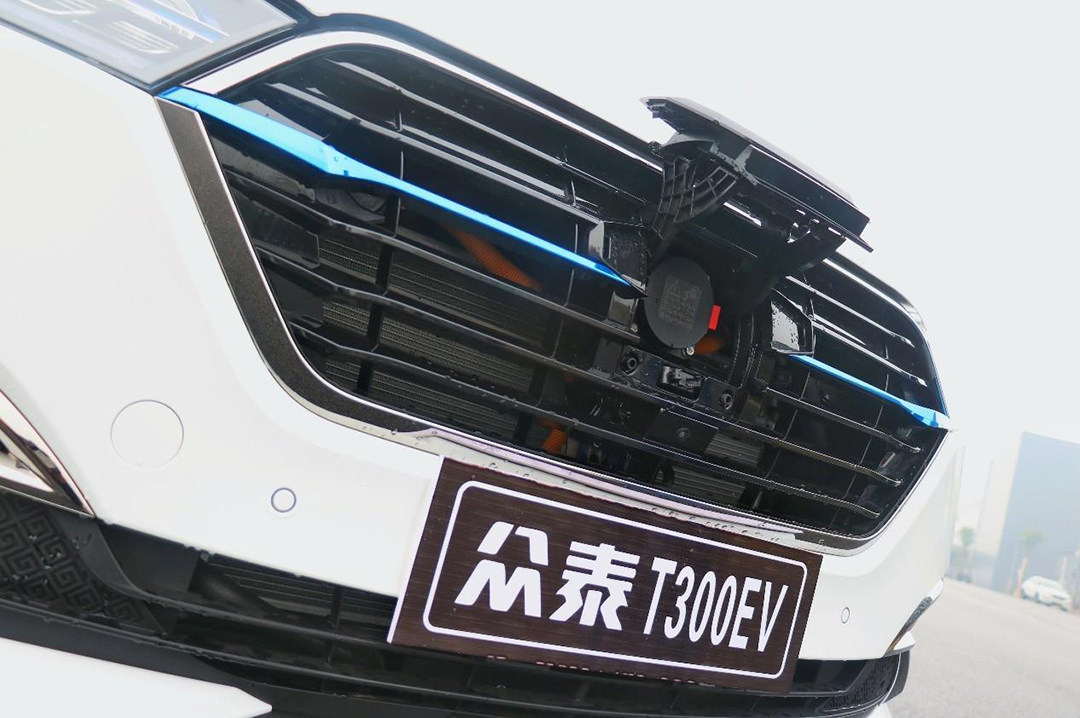 众泰T300EV基于T300燃油版打造而来,在外观上与汽油版车型基本维持一致,只是部分细节位置作出相应的调整,首先是车头前脸部分,T300EV的中网采用六边形大嘴式熏黑格栅中网,并有一条蓝色饰条横穿,象征着该车拥有新能源动力。而蓝色车标则有隐藏式快充充电口,慢充充电口则被布置在左后轮眉处。