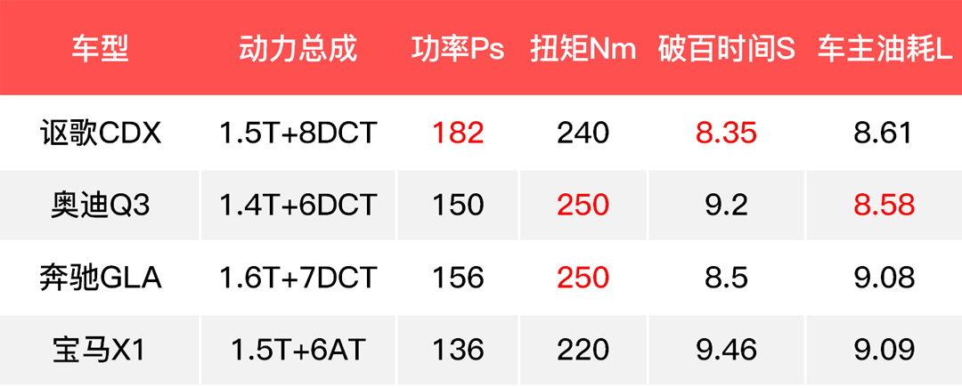从上面的表格中,咱们可以发现这几款车型的功率差异略大,讴歌CDX的1.5T发动机功率具有优势!另外这些车型的峰值扭矩都不错,同时低扭表现也可圈可点。