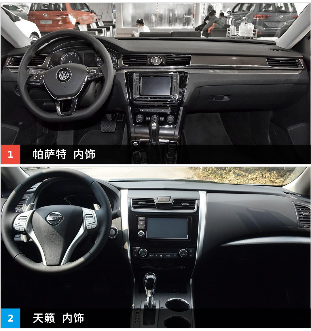 帕萨特的内饰与外观互相呼应,还是直来直往的风格,采用T型中控台的设计,视觉效果比较简约,略带一些沉闷,但是好在各个功能区都很清晰,使用起来还是比较顺手的。天籁的内饰设计同样简约,采用对称式的设计,非常普通,并没有什么时尚的元素。