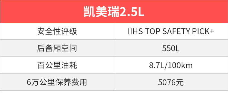 凯美瑞的车身设计遵循了丰田GOA的核心理念,即兼顾高强度乘员舱和高效冲击吸能的车身结构。因此,凯美瑞获得了美国公路安全保险协会IIHS的最高安全评级。550L的后备厢空间在放下婴儿车后还有足够大的空间容纳其他杂物。凯美瑞的2.5L发动机采用了直喷/歧管喷射并存的双喷射技术,在实际情况下,会比只有直喷的发动机更省油,而且有了歧管喷射来冲刷进气门的背部,也不容易产生积碳。凯美瑞的保养政策是前两次免费,所以6万公里保养费用比较低。