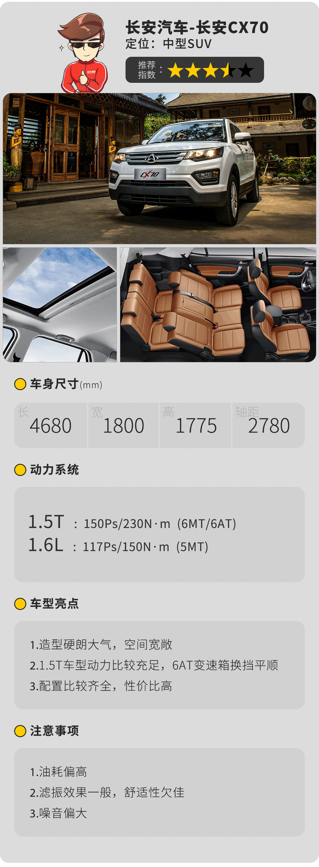 长安CX70的外观造型硬朗,内饰在同级中比较显档次感,七座布局的实用性也比较可观。