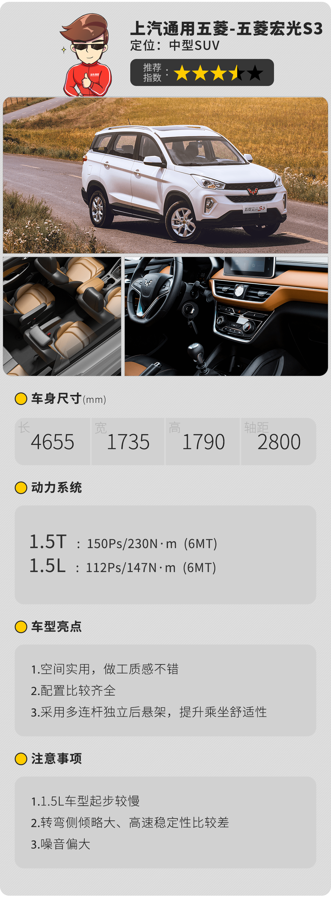 五菱宏光S3基于神车五菱宏光打造而来,长度以及轴距都达到了中型SUV的水平,但是宽度一般般,所以看上去有点高高瘦瘦的感觉。内饰采用最新的家族式设计风格,令人惊喜的是中控还有一些软性材料包裹,做工质感并不掉价。