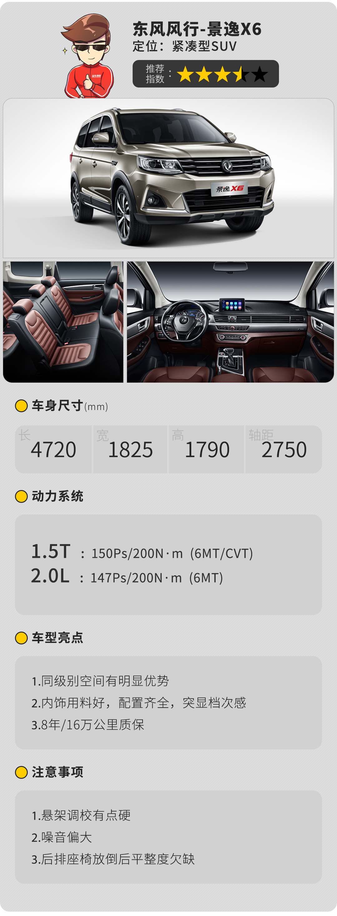 动力方面,1.6L自然吸气发动机匹配的是5挡手动变速箱,动力基本够用并且离合器的结合点能清晰找到,而它的1.5T车型的动力输出更加充足一些,同时来自爱信的6AT变速箱平顺性不错、传动效率高。