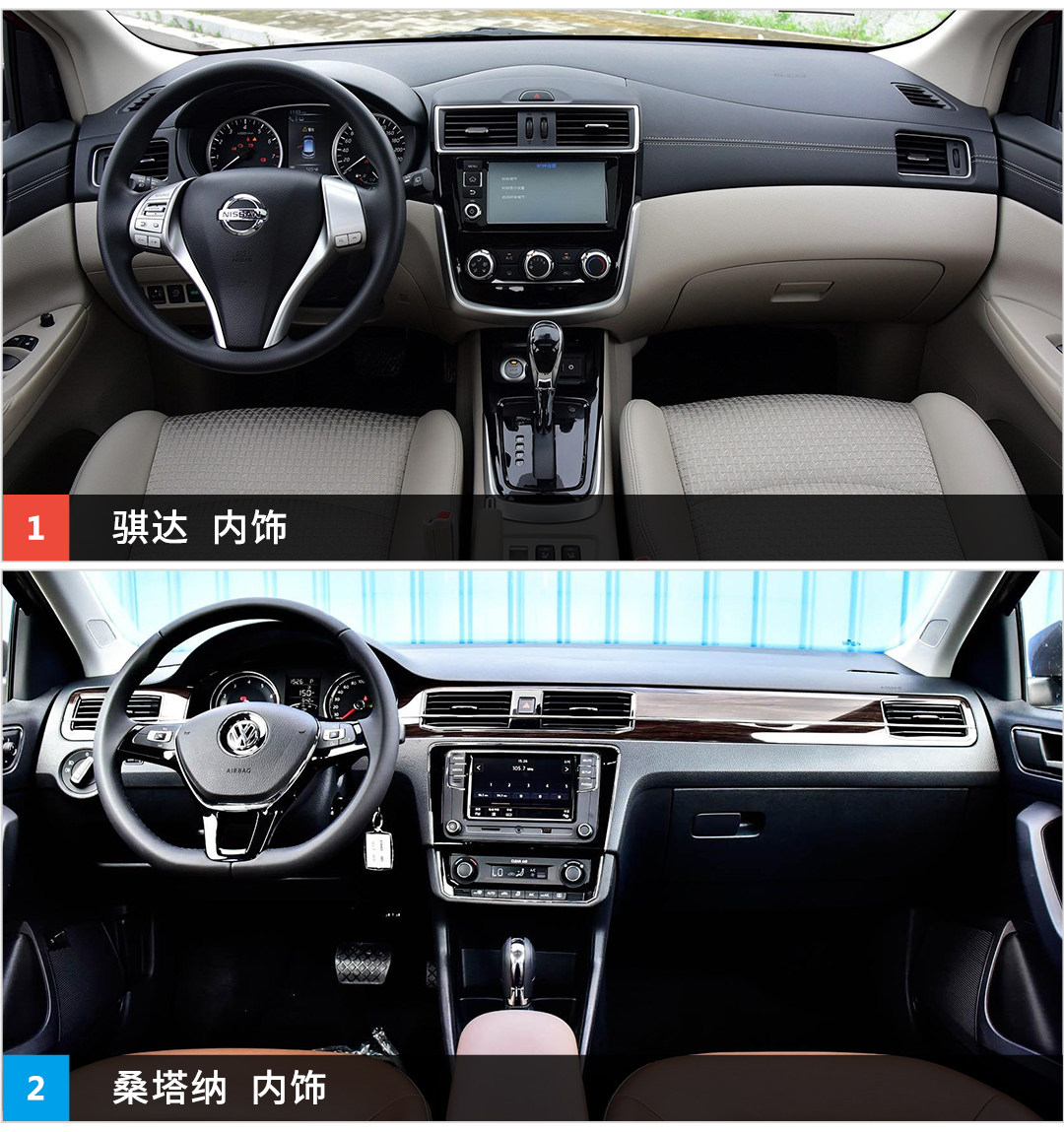 骐达与桑塔纳的内饰都是以简约为主,其中骐达采用的线条较为圆润,中控台采用对称式的设计,上方覆盖软质材料,质感还是挺不错的。桑塔纳中控台则是采用大众家族式的设计,线条直来直往,相比骐达来说更加沉稳内敛。桑塔纳中控上方多采用硬质材料,手感不及骐达,好在做工不错,缝隙比较均匀。