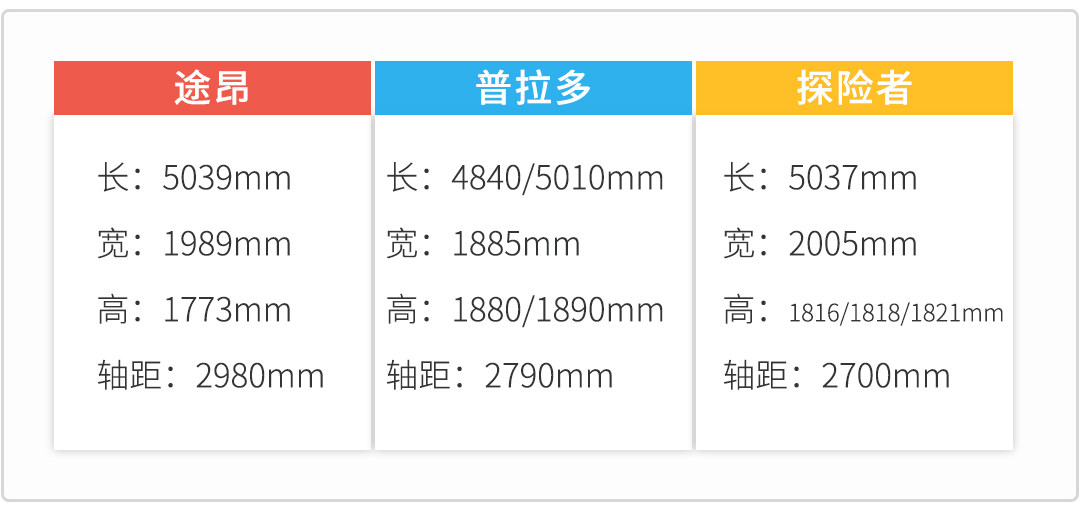 尺寸方面,三车的长度很接近,探险者的车宽最宽;普拉多的车高最高;而途昂的轴距是最长的,而且比另外两部车都要长不少,长轴距的车型更利于车内空间的布置,不过由于三辆车都已经达到了中大型SUV级别,而且都是7座车型,所以空间方面其实不必多虑。