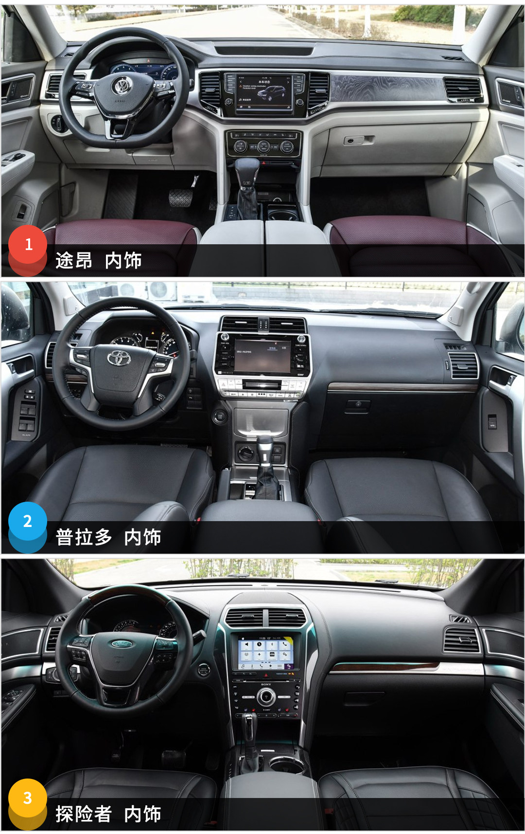 虽然三辆车都不是豪华品牌,但是从售价来看,三辆车都超越了普通品牌的水平,所以内饰方面也绝对不能落伍。途昂的内饰还是很“大众”,满满的家族气息,只不过比起其他大众车型,横向面积更舒展,而且用料也更高级。普拉多的内饰一直都饱受好评,坐进车内后很容易就被其舒适性所征服,软材质应用到位。但探险者的内饰设计就比较中庸,这也是福特车的特点,设计一向以来都比较平淡,不过用料方面还是很厚道。