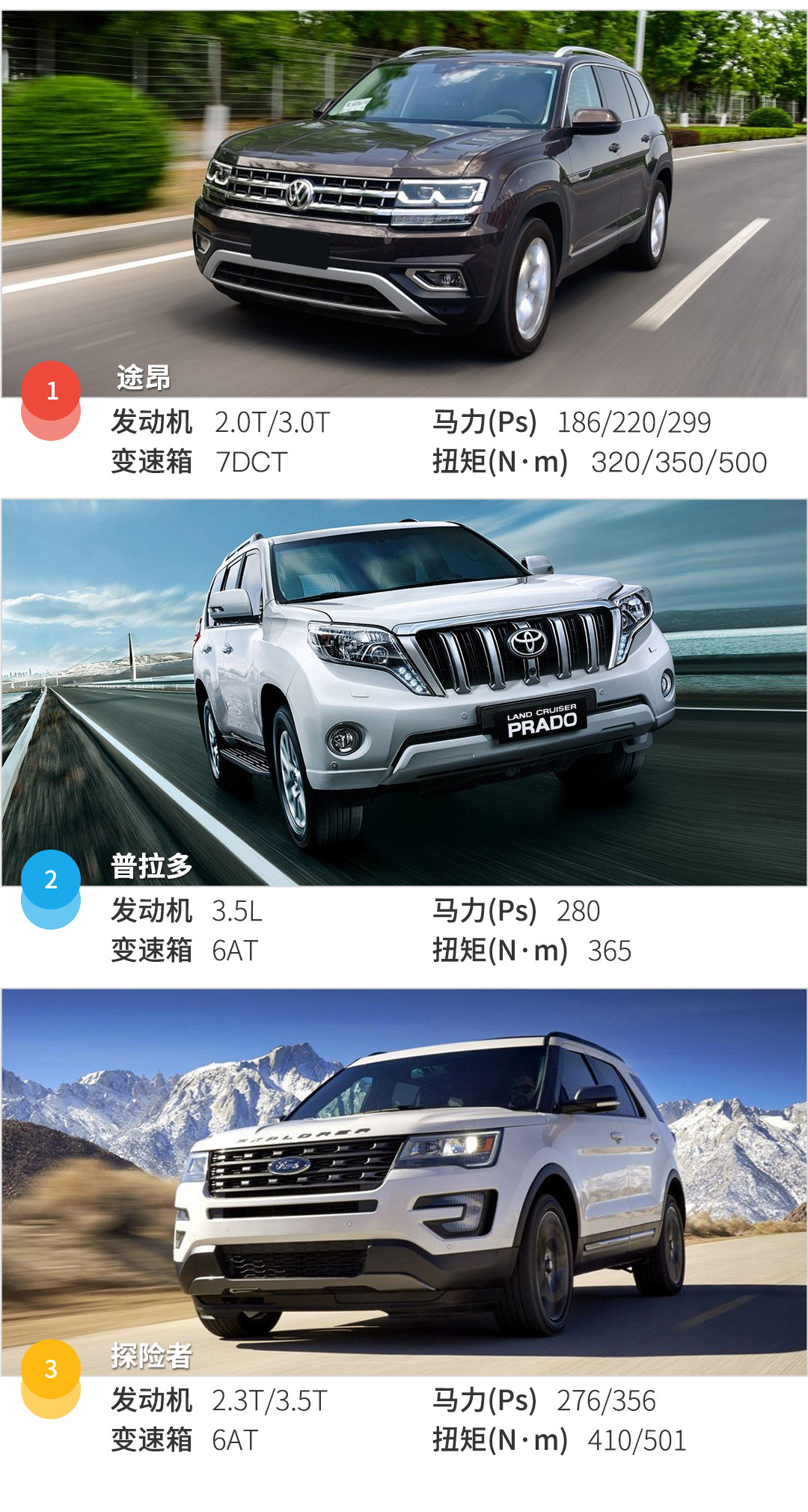如果宏观市面上的所有合资中大型SUV,途昂可是说是定价非常低的一款,以至于它没有多少直接的竞争对手,这也是他能在最近一年时间里月销量能到达1万辆左右的原因之一,那实际上到底在这个价位还有谁能与之匹敌?我们把终端优惠的价格也考虑进去,发现丰田的普拉多和福特的探险者似乎也很吸引人,对比一波看看。