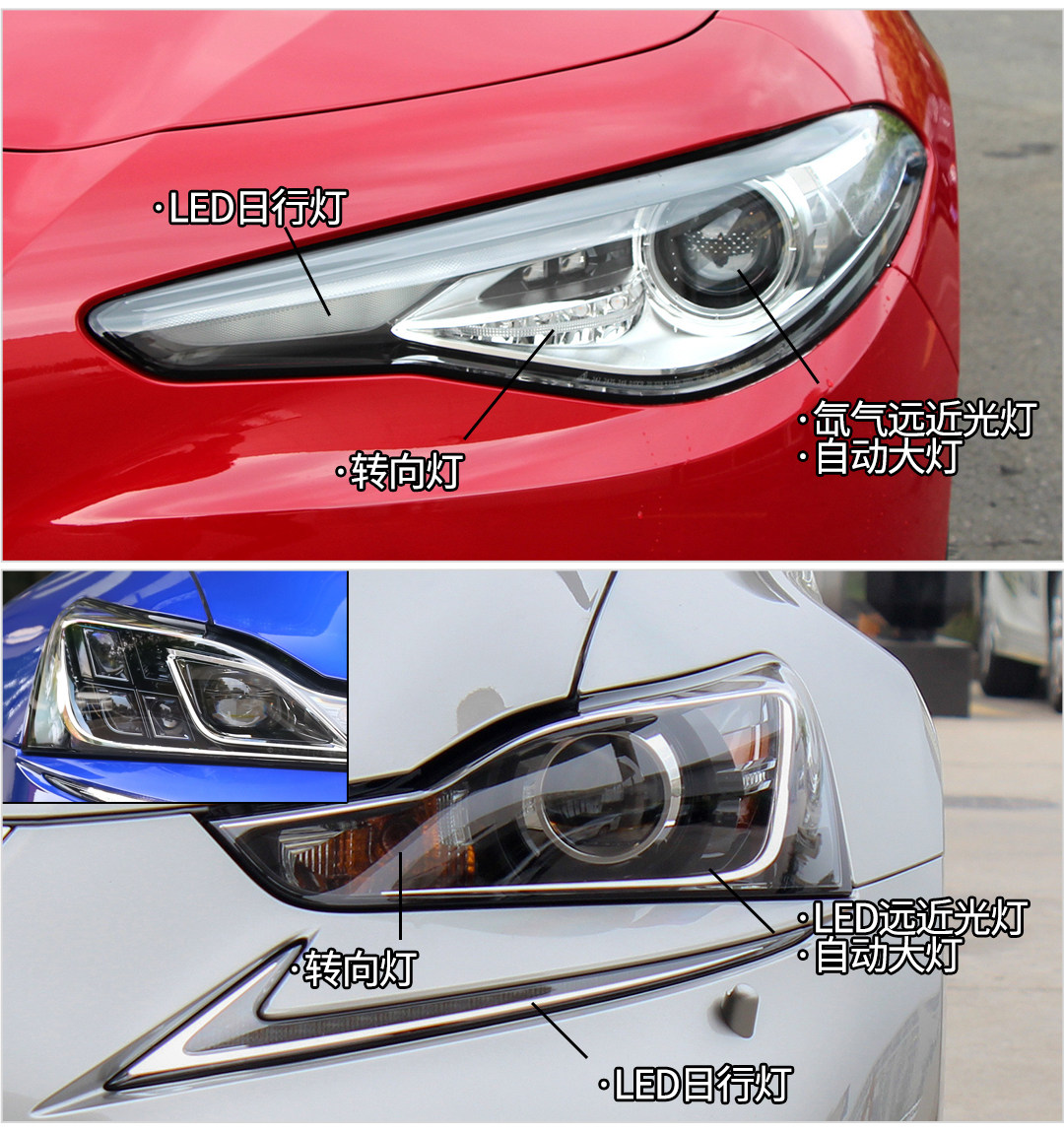 而IS就高档一点,全系标配LED远近光灯、LED日行灯以及自动大灯,不过高低配的造型有所不同,高配点亮后是四颗菱形的灯组,犀利又优雅。