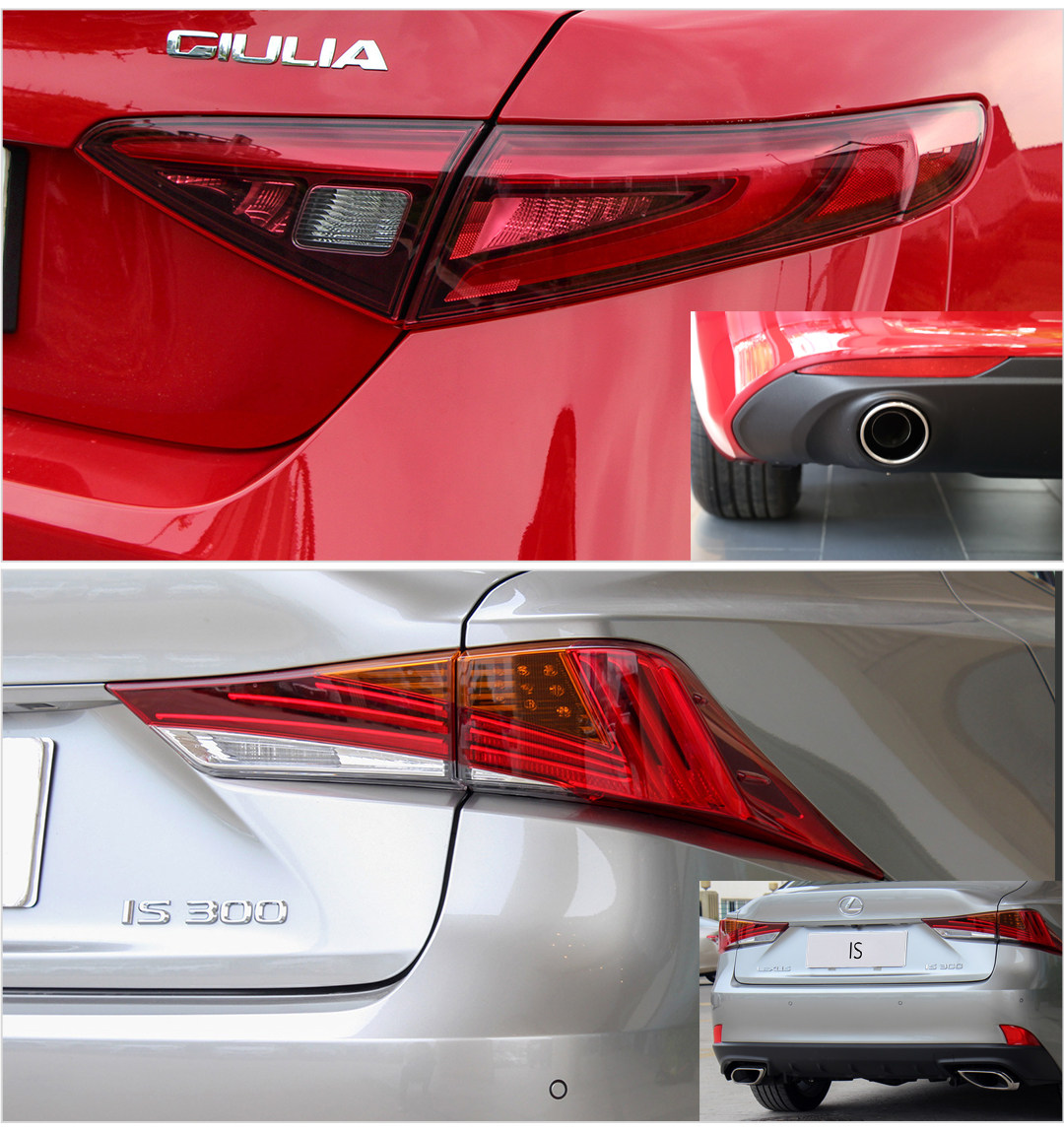 车尾部分,两款车的尾灯造型都足够独特,IS的尾灯更具视觉冲击力,尖锐的L型LED示宽灯,而且是双边共双出排气,而Giulia只有单出排气,气势上稍弱一筹。