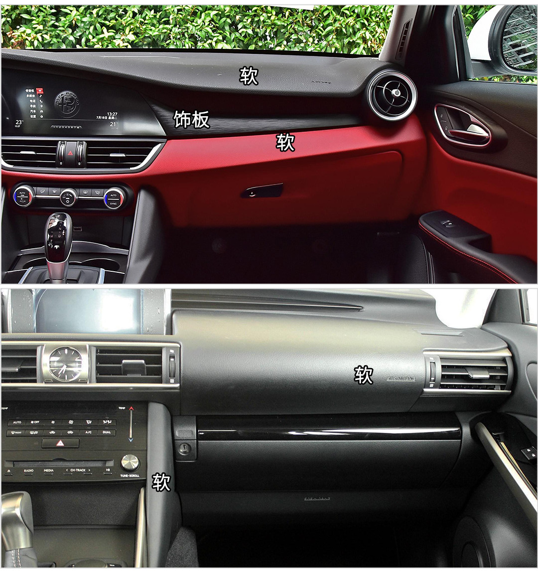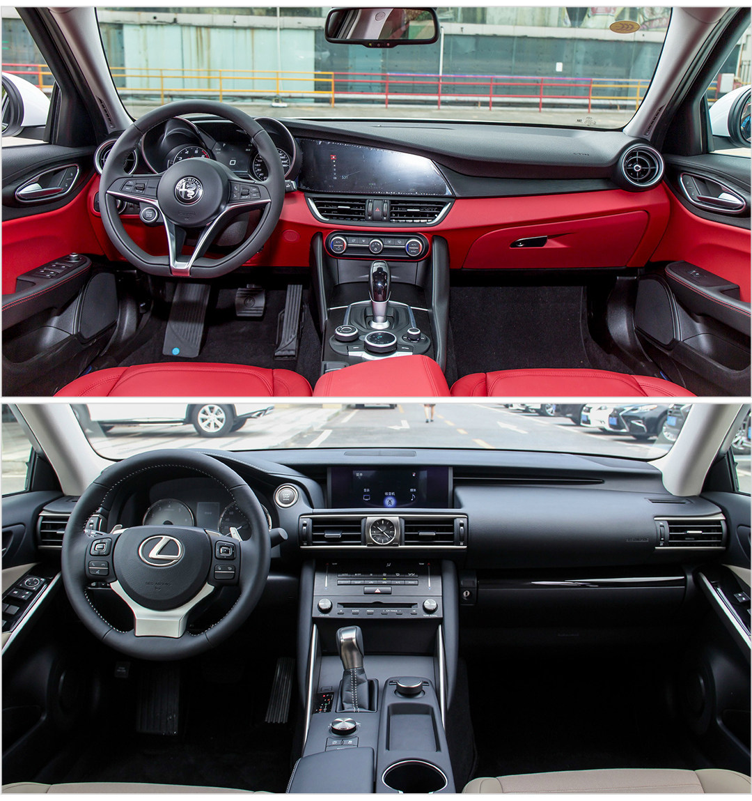 Giulia中控台上下方都是大块厚重的软材料,手感非常棒,而IS同样是大面积的软材料,手可以摸到的地方都是软的,完全不虚BBA,两款车内饰用料和做工都比较令人满意,而且高低配的用料区别不大,只有装饰有些许不同。