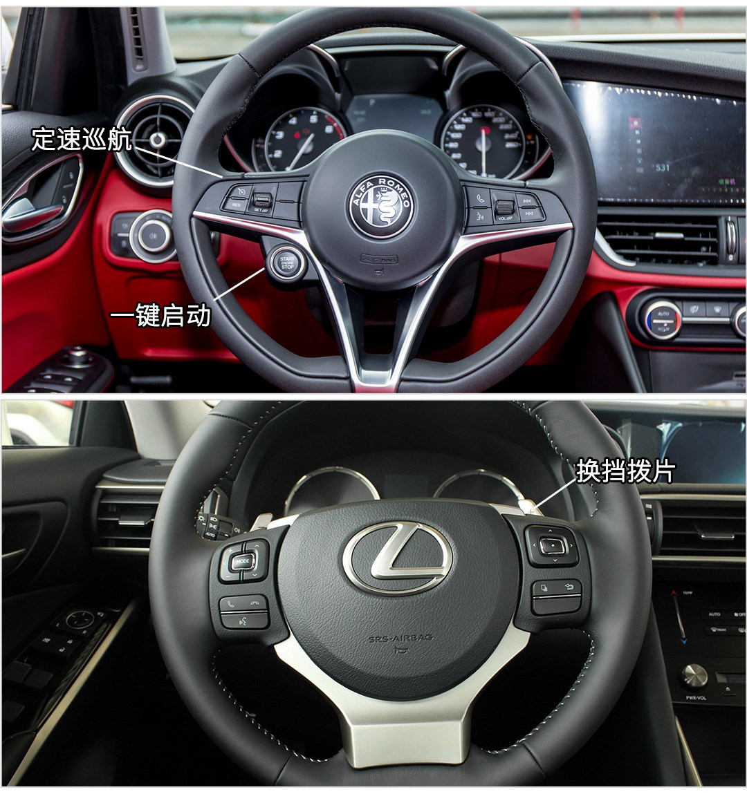 均采用真皮多功能方向盘,Giulia一键启动启动放在方向盘上,仪式感更强,并且配备定速巡航功能,不过遗憾的是那副硕大的拨片并没有标配,280HP以上车型采用;IS就没有定速巡航了,不过标配了换挡拨片,增强运动性。