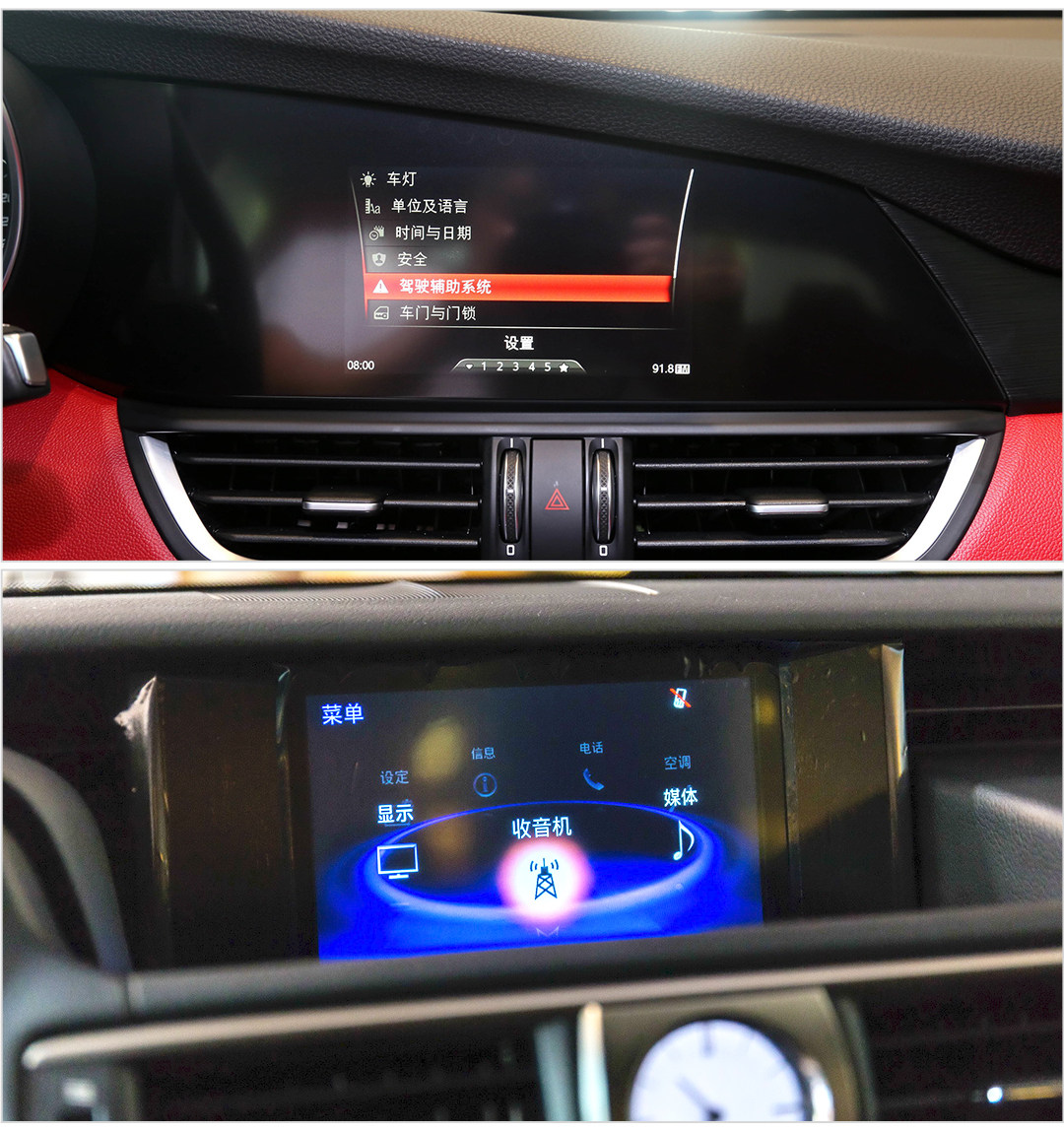 中控屏都是采用比较传统嵌入式,前者为6.5英寸,后者为7英寸,只配备蓝牙连接,CarPlay等手机互联系统两车均没有配备,值得注意的是IS配备了前后雷达和倒车影像,相当厚道,而Giulia只有一个后驻车雷达。