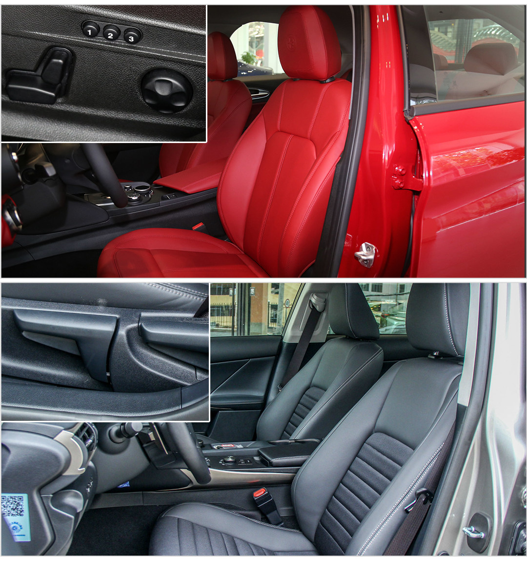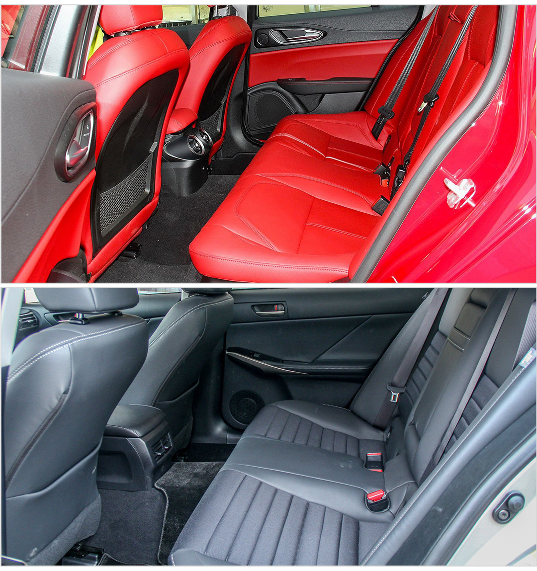 座椅配置方面,两者分别是真皮和皮织混搭+仿皮,Giulia前排支持电动调节而且可以调节腰部支撑,还有三套坐姿习惯可以设定,这些都是IS没有的。