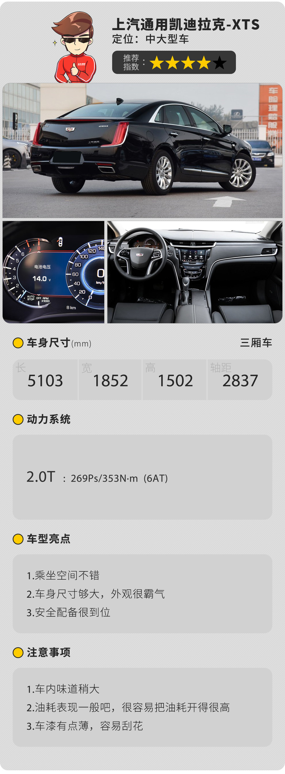 凯迪拉克XTS的车长约5.1米,沿用家族式的“砖石切割设计语言”,整体外观肌肉感很强,看起来十分霸气,彰显出中大型轿车应有的气场。内饰更多的是沿用了“盾型”的设计元素,整体有很强的对称感,而且用料到位。动力方面,XTS全系搭载的是ATS-L同款发动机,动力是很强劲的,但是比较可惜的是XTS配备的变速箱仍然是6AT的。