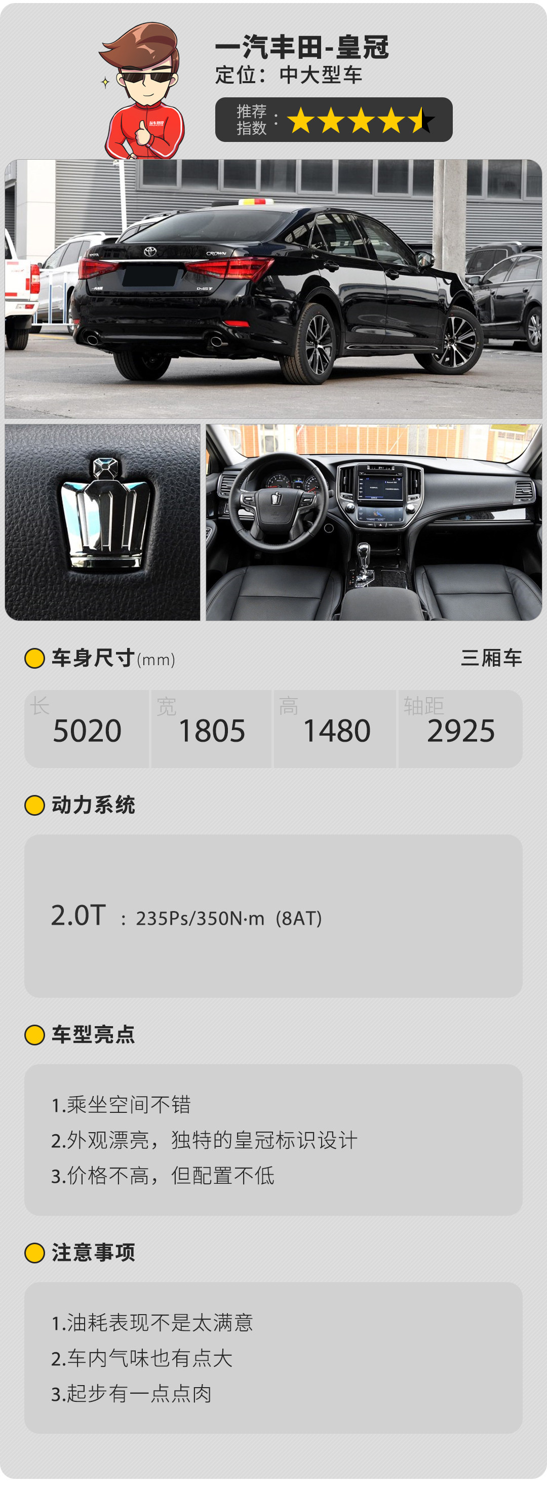装饰的皇冠标识无疑是独特的设计,为其增加不少档次感。刚好超过5米的车身也让这辆旗舰级车型带有足够的气场,不过车身宽度却是消费者一直投诉的,因为车厢内的横向空间并不是很充裕。内饰设计显得很庄重,大面积的皮质包裹营造了不少豪华氛围,而且该有的配置都到位。皇冠过去的V6发动机已经不复存在,现款全系搭载2.0T的涡轮增压发动机,动力表现中规中矩,也没有太高的燃油经济性,表现一般般吧。