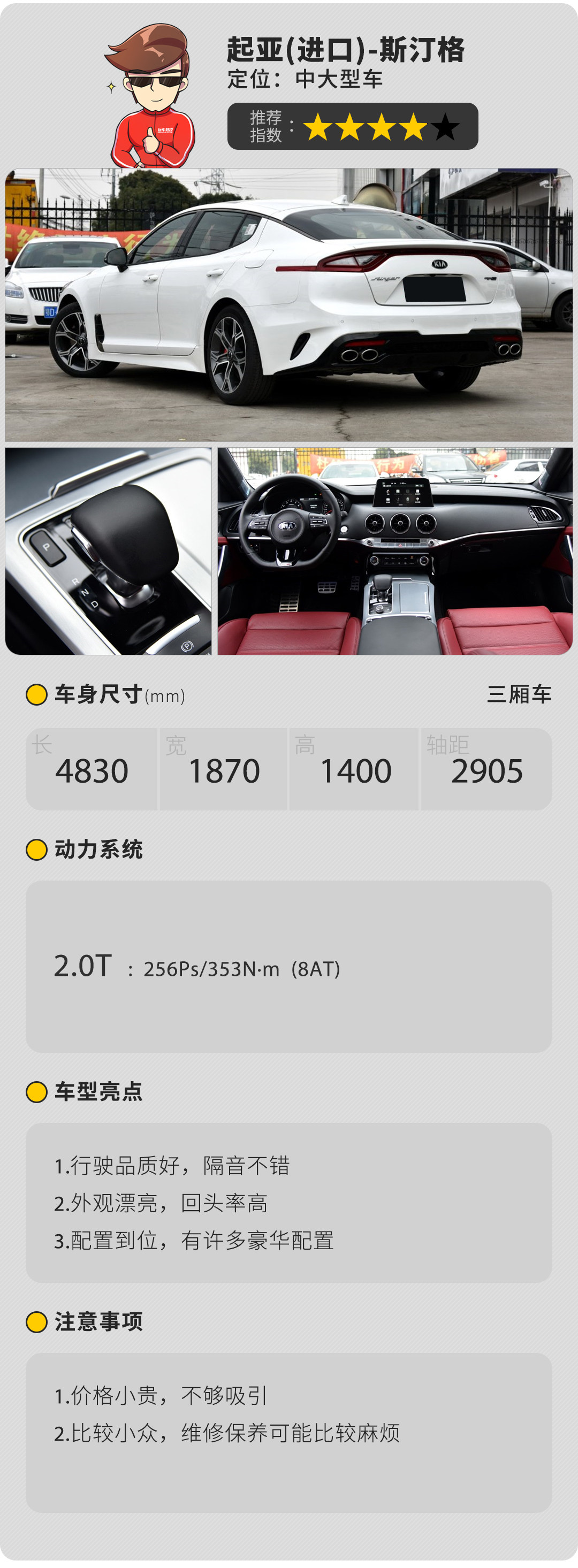 斯汀格是起亚旗下从未出现过的一款全新4门轿跑车型,也是定位为中大型轿车,发布前后引起了不少关注,而且在一些设计大奖和十佳发动机评选都榜上有名。不过自上市后,销量平淡,关注度也渐渐衰减。而在中国上市只引进2.0T车型,所以售价也不会太贵,总共有两款车型可选,售价分别为27.98万和31.98万,而且现在还有一定优惠,不过优惠多少还是以4S店为准。