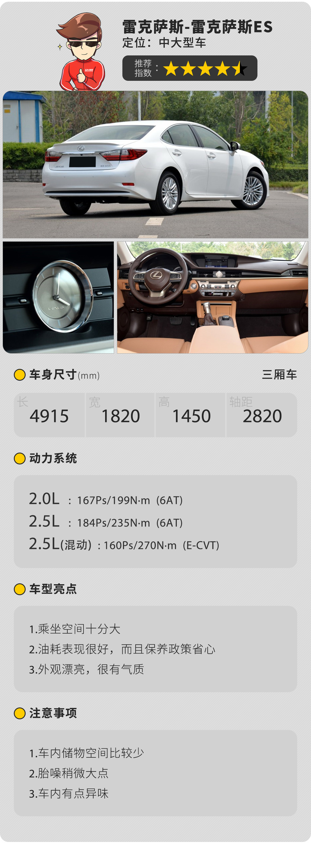 新款ES的外观内饰的确很不错,但现款也一点都不差,凶悍的前脸,协调的车身,富有质感的内饰都是ES比较诱人的方面。动力参数虽然比较一般,但这个级别的车型更多的是讲究动力输出的平顺,在日常驾驶中能保证应有的舒适。 还有就是空间方面,虽然说到了这个级别一般都不会有什么顾虑,但不得不提的是ES的空间表现真的很出色。