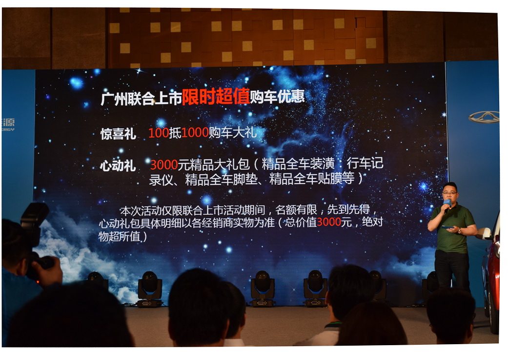 此次的联合上市,奇瑞还为广东的用户提供了价值4000元的大优惠,包括100抵1000的购车大礼和3000元的精品大礼包,数量有限,先到先得。