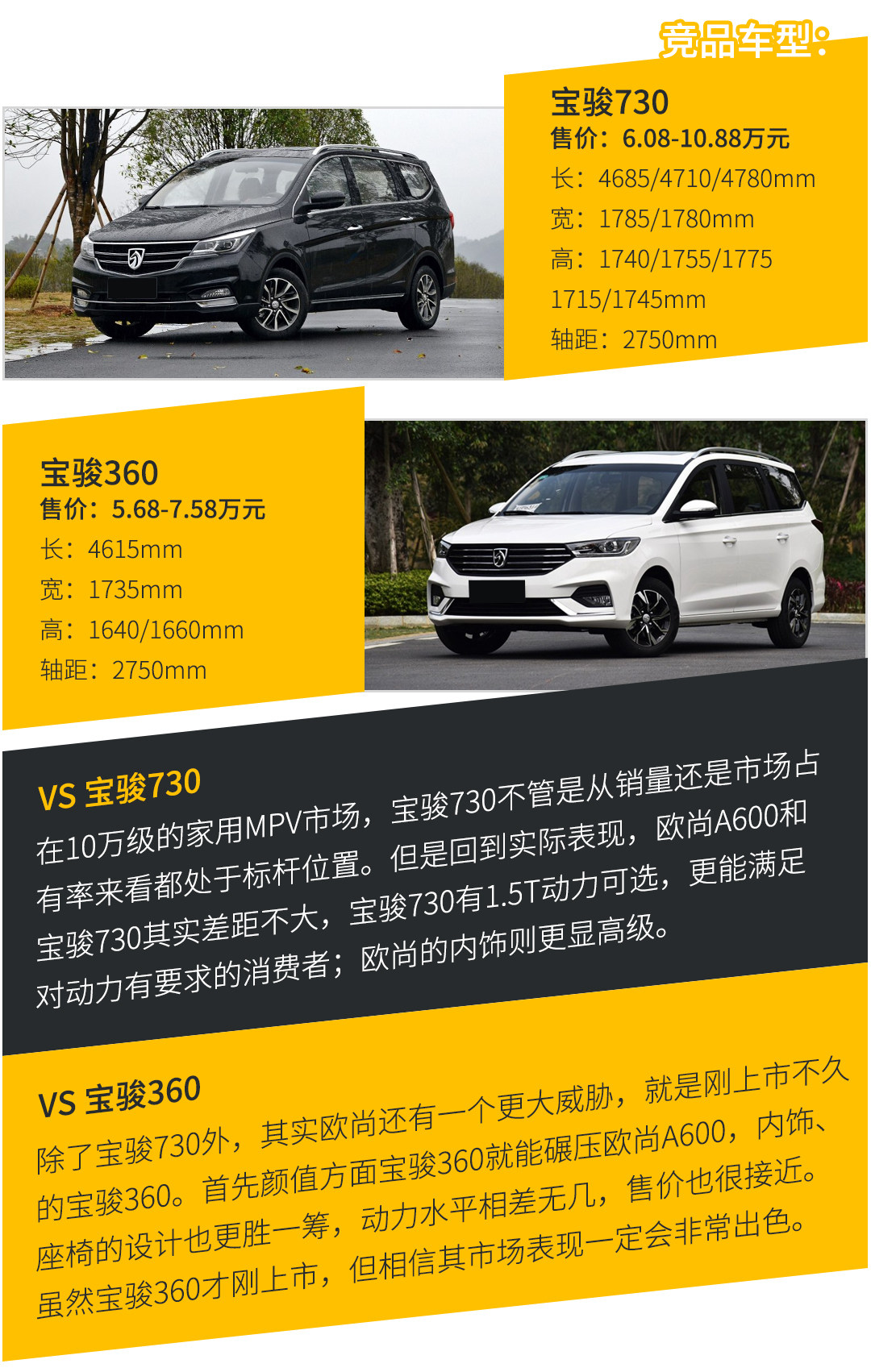 结尾:其实我个人认为欧尚A600在这次改款中,做得最不好的是,一外观升级不明显,颜值没拉上来,二是自动挡车型售价太高,这两点以至于它丧失了不少竞争力,从最近的销量表现来看,欧尚A600想要取得好的销量成绩其实有点悬。如果你对10万级以内的家用MPV有想法,建议你出门右拐,宝骏360真心不错。
