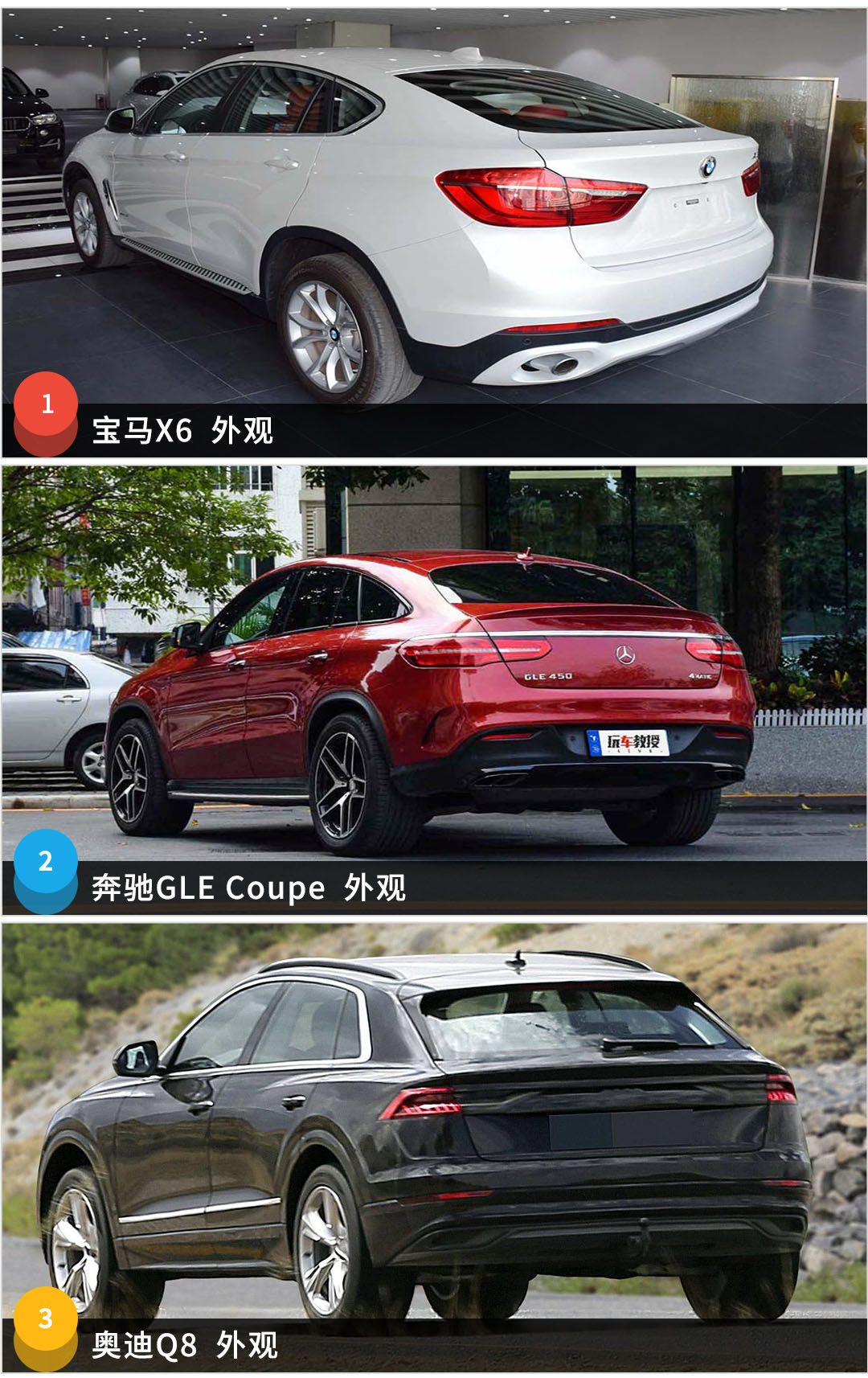 首先来看看最直观的外观,运动型SUV最大的特点是其溜背的尾部造型,三台车风格各异,GLE Coupe强调的是柔和、圆润饱满,X6呈现的是棱角分明,奥迪Q8则是沉稳有力量感。细心观察可以发现,GLE Coupe与X6在视觉上都拥有微微上扬的腰线,而奥迪Q8相对比较平直,对比另外两台车,奥迪Q8的设计要沉稳不少。三款车都有自己的风格,正所谓萝卜青菜各有所爱,这也是三台车差异化的地方。