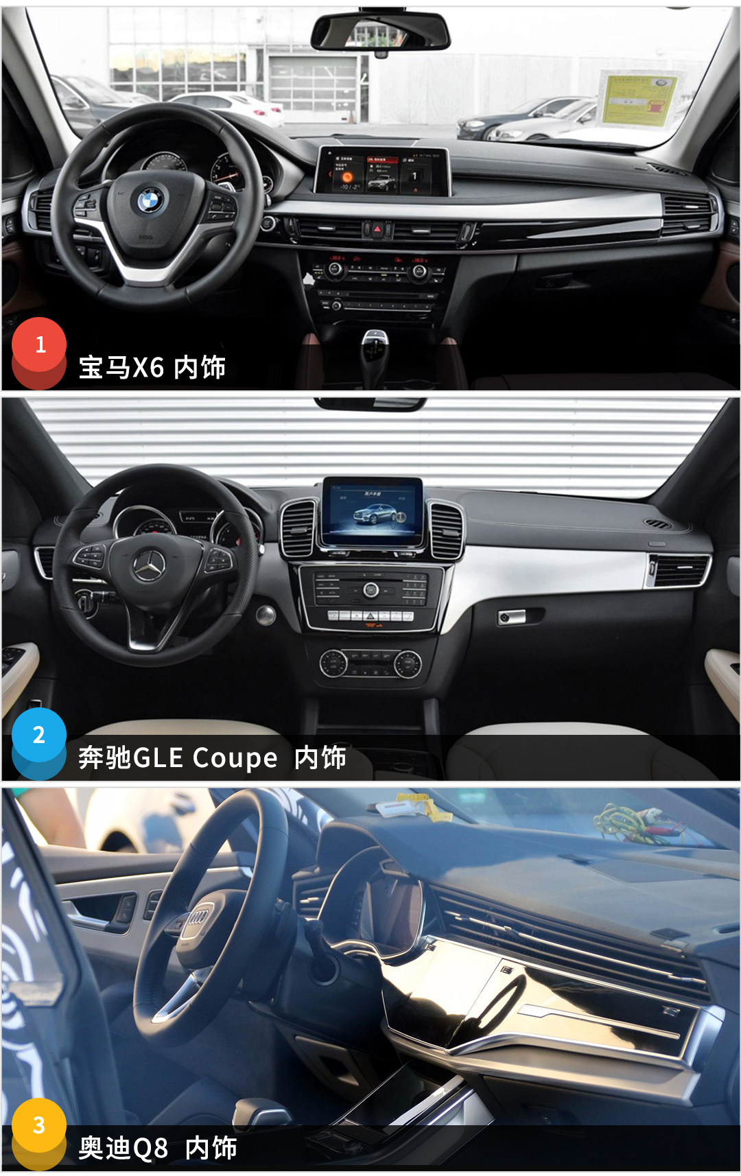来到内饰,不用我说也一目明了,奥迪Q8的内饰在科技感以及设计感上完全碾压它的对手,这也是奥迪的特色。话虽如此,毕竟GLE Coupe与X6上市已有一定时间,因此在内饰上对比于全新的对手显得老旧是在所难免。