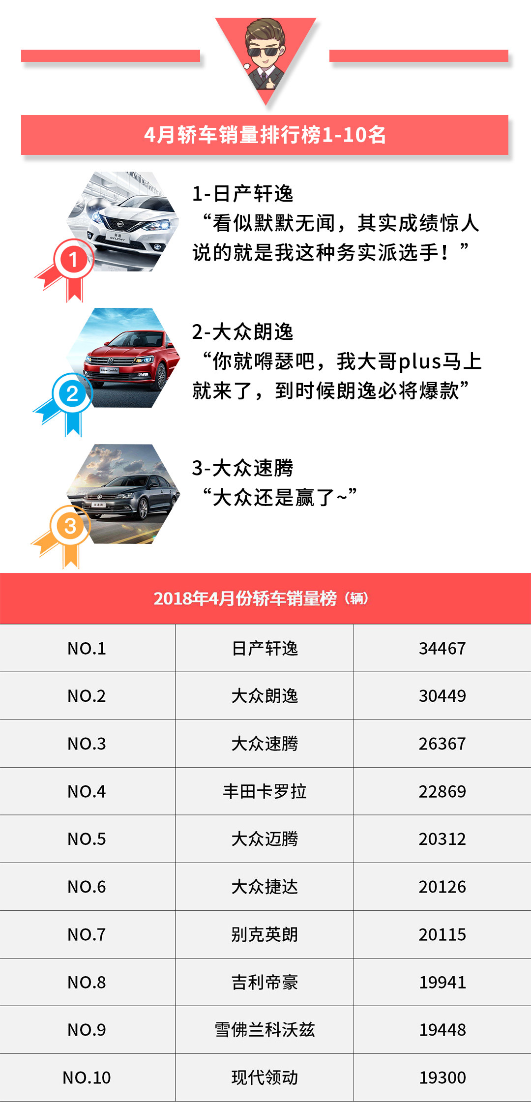 四月份的轿车销量榜单就是如此,放眼望去前十名的热销车型中九位都是合资品牌,轩逸强势占据销量榜首位,大众依然唱主角,不仅是前十名中有四席占据曝光率最大的品牌,而且濒临换代的朗逸依旧畅销,虽说丢失第一的位置,但也仍是当月唯二销量破三万辆的车型之一。