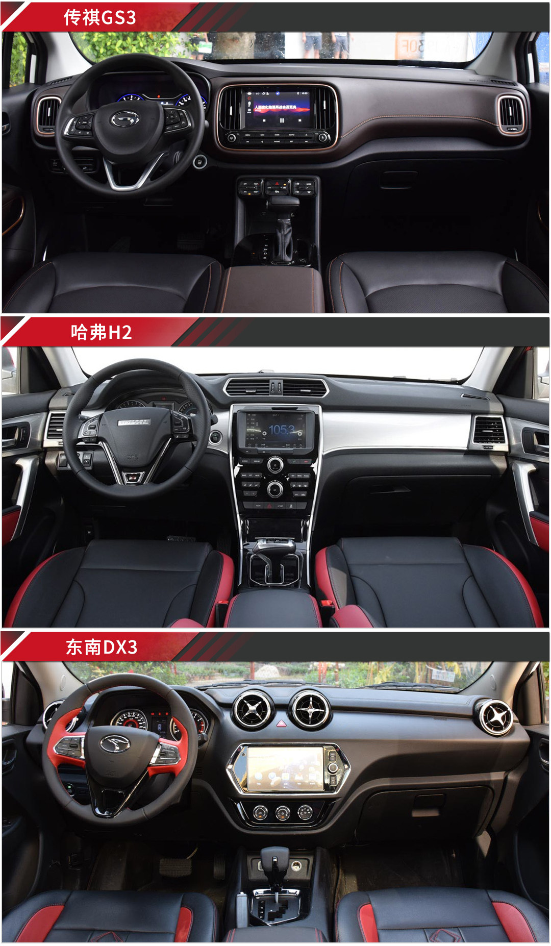 内设计上三款车也是平分秋色,各有各的亮点。传祺GS3内饰设计运用了较多的圆角设计,在视觉效果上虽没有太大的冲击力,但却给人感觉很有亲和力,没有距离感;而DX3内饰设计就比较有新鲜感,无论是在配色还是在造型设计都展现了非常不错的设计感,更是巧妙的融合了时下年轻消费群体的审美观;至于哈弗H2内饰造型就比较简约,不过时尚感还是很出众,大量软性材料和精细做工的相结合以及中控平台下的金属色饰板很好的带出了不俗的高级感。