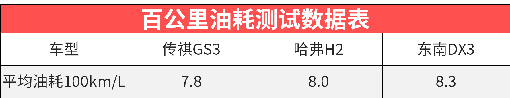 在百公里油耗测试过程中,GS3百公里油耗为7.8L,相对于H2和DX3两款车来说要低很多,燃油经济性会更好点。