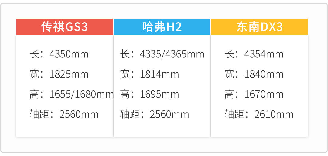 在车身尺寸方面,哈弗H2在高度上要比GS3和DX3高出15-40mm不等,在车身高度上占有非常大的优势,但在车身长度和宽度方面就要略输于GS3和DX3。