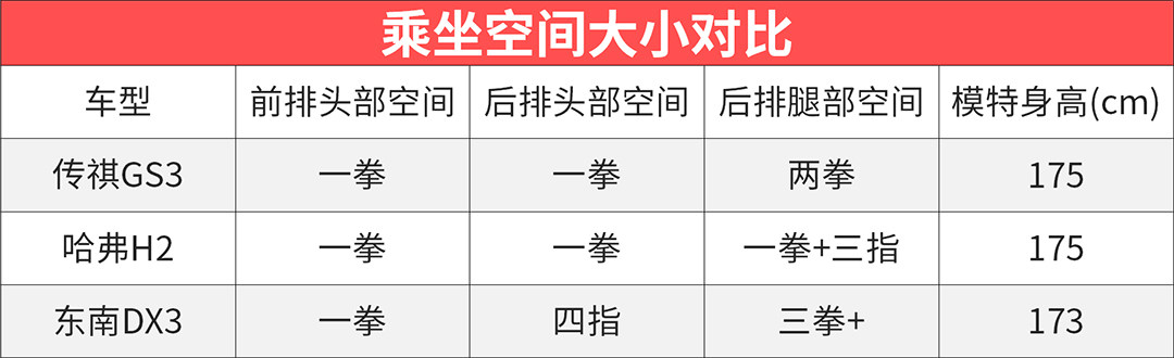 乘坐空间方面,三者的乘坐空间都还比较大,宽敞度非常不错,给人的感觉不会很压抑,座椅的人体工学设计也非常到位,坐起来舒适性很不错。值得一提的是,DX3和GS3的后排座椅中间靠背都设置了靠枕,完全考虑到了后排中间乘客的乘坐感受,非常人性化。