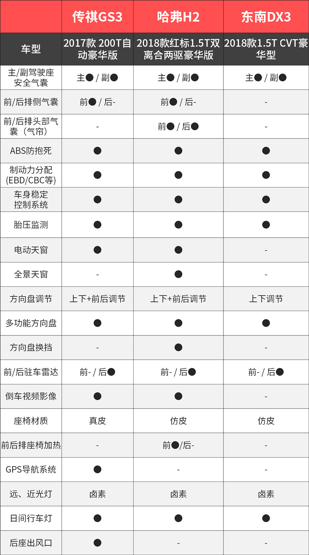 配置方面,教授在这选取了三款车比较热销的版本进行对比分析,从配置对比表格来看,哈弗H2和传祺GS3在配置丰富度上相差并不是很多,但在主动安全配置方面H2要稍占优势,令人感到遗憾的是它并未配备GPS导航系统,至于东南DX3在配置上就略微有点稀缺。