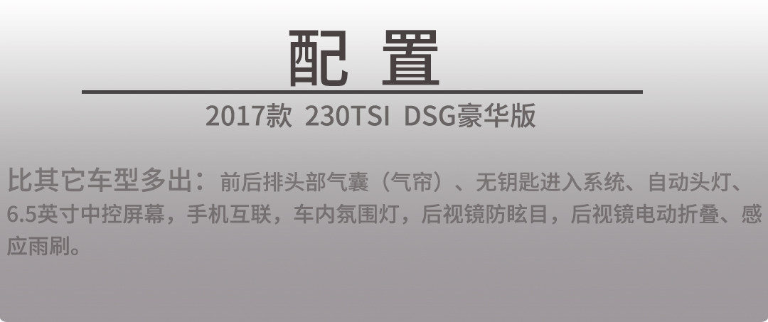 2017款 230TSI DSG豪华版是大众DSI+DSG的黄金组合:1.4T+7速双离合,虽是干式双离合,但实际不论动态表现还是耐用程度都非常不错。